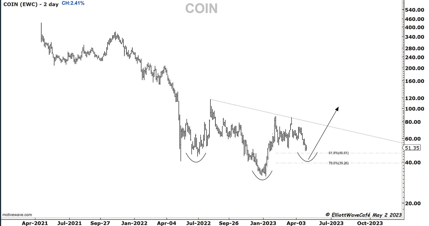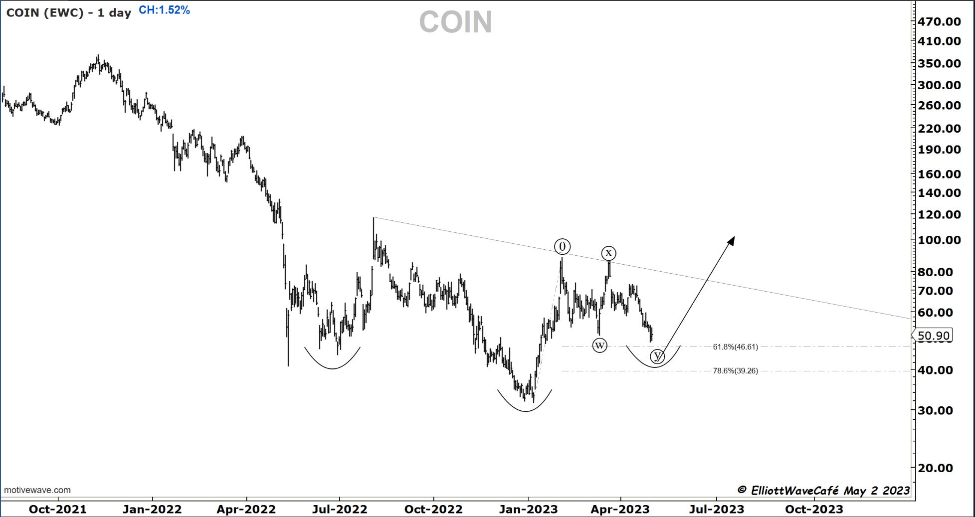 If Coin has found a low in this market, then the current levels should become interesting to the long side from a pattern perspective. Staying above 40 is very important. Staying above 45 is even better. If this holds, we could be looking at $120 next for Coinbase. The corrective pattern appears as a combination.