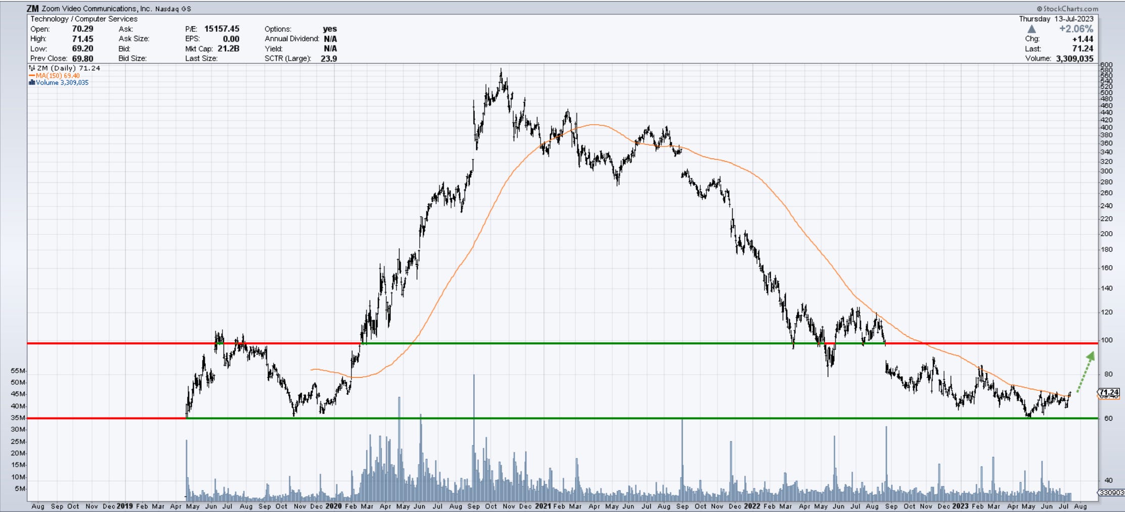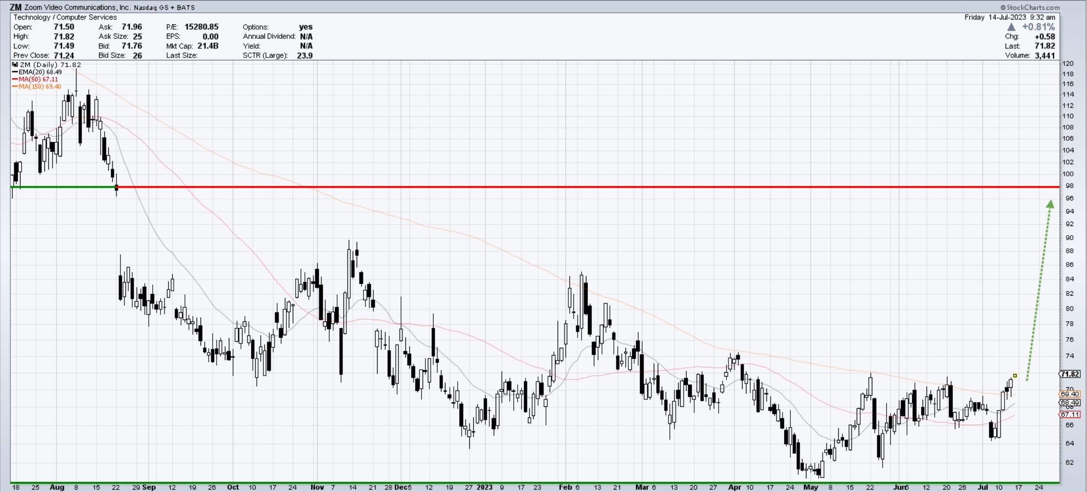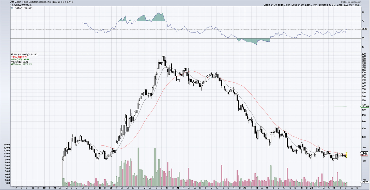First time since 2021ElliottWaveCaféJul 14, 20231ShareClose eyes on Zoom here as we’re about to get the first weekly close above 150 day since the summer of 2021. There is a large potential of this stock traveling to 100 over the next few months. Crisewcafe@pm.me