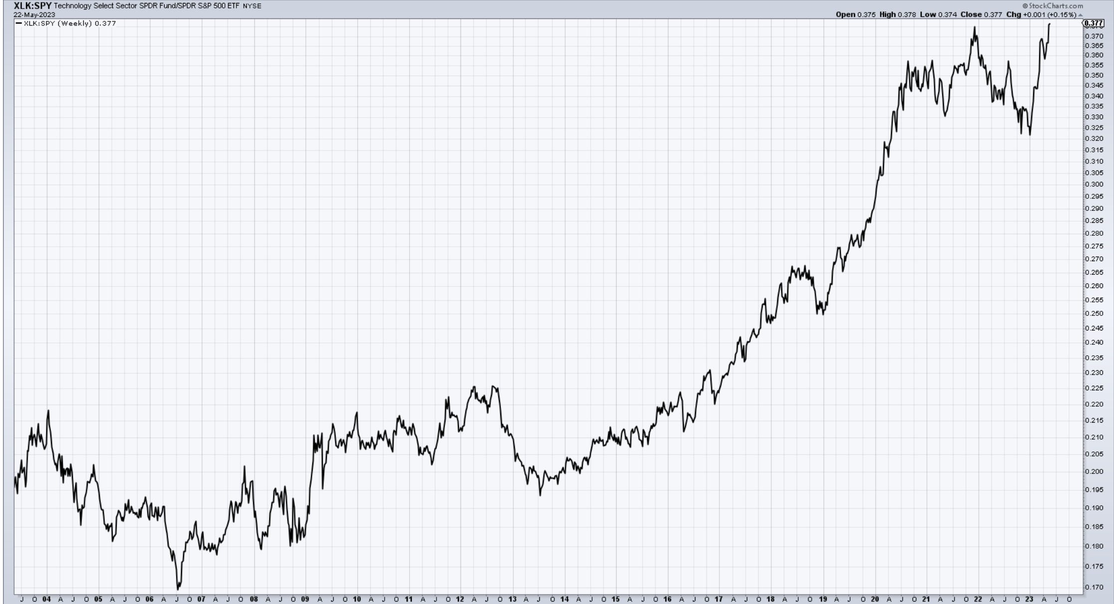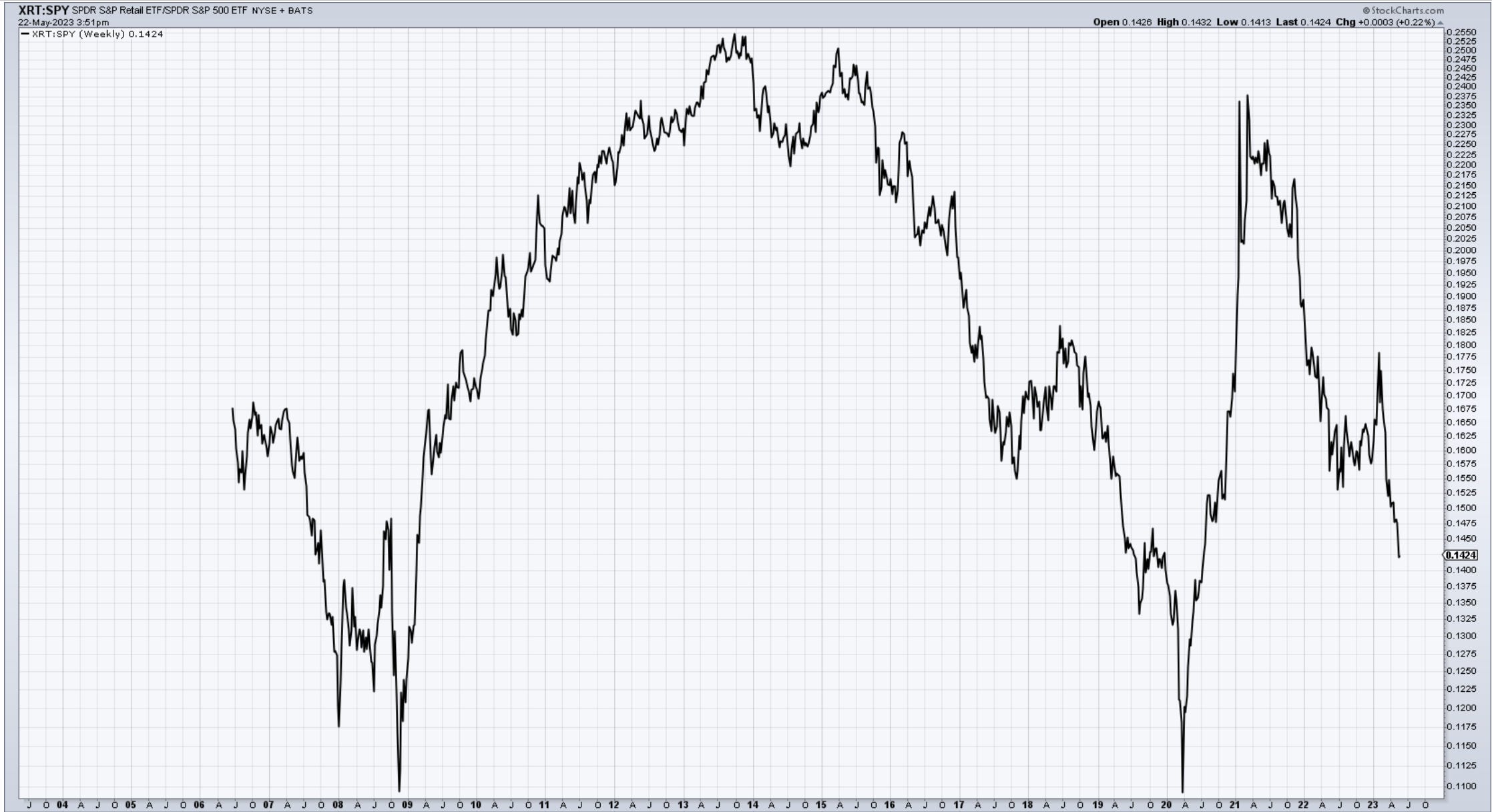 Here is a ratio graph of XRT retail ETF vs. SP500 . When the line goes down, the first ticker underperforms the second. When the line goes up, it’s the other way.