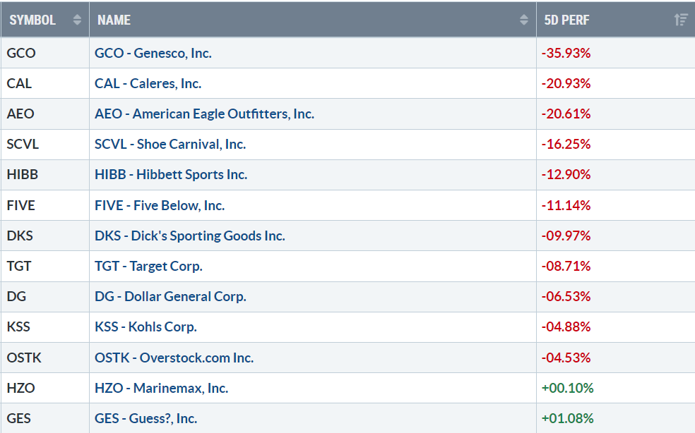 Just a few days later, the retailers mentioned below performed as such. To be truthful, they are far from being done selling. I would continue to sell the rallies. — see original post below