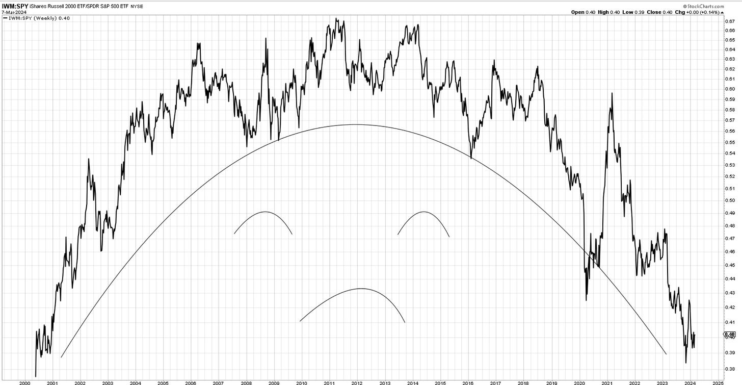 An upset chart is a ratio between small caps and spiders. There have been 10 years of outperformance, followed by another 10 of underperformance. Where do we go from here now that we’re re-visiting 2000 lows?
