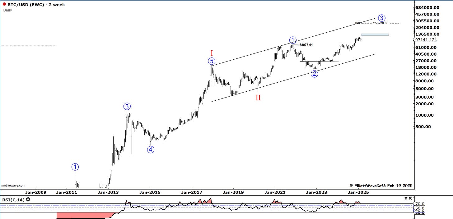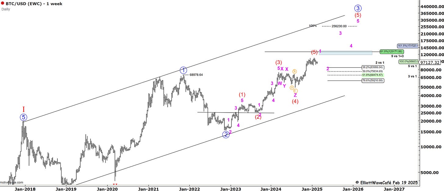 My wave count is a bit messy and with several scenarios but I continue to look for 129k before we can say that possibly a wave (5) top is upon us. I feel that if that top was already in place , we would have already started to correct deeper which we really haven’t. If we do break 92k, than it will be more evident either wave (5) or 1 are in place. Until then , we stay focus on further uptrend.