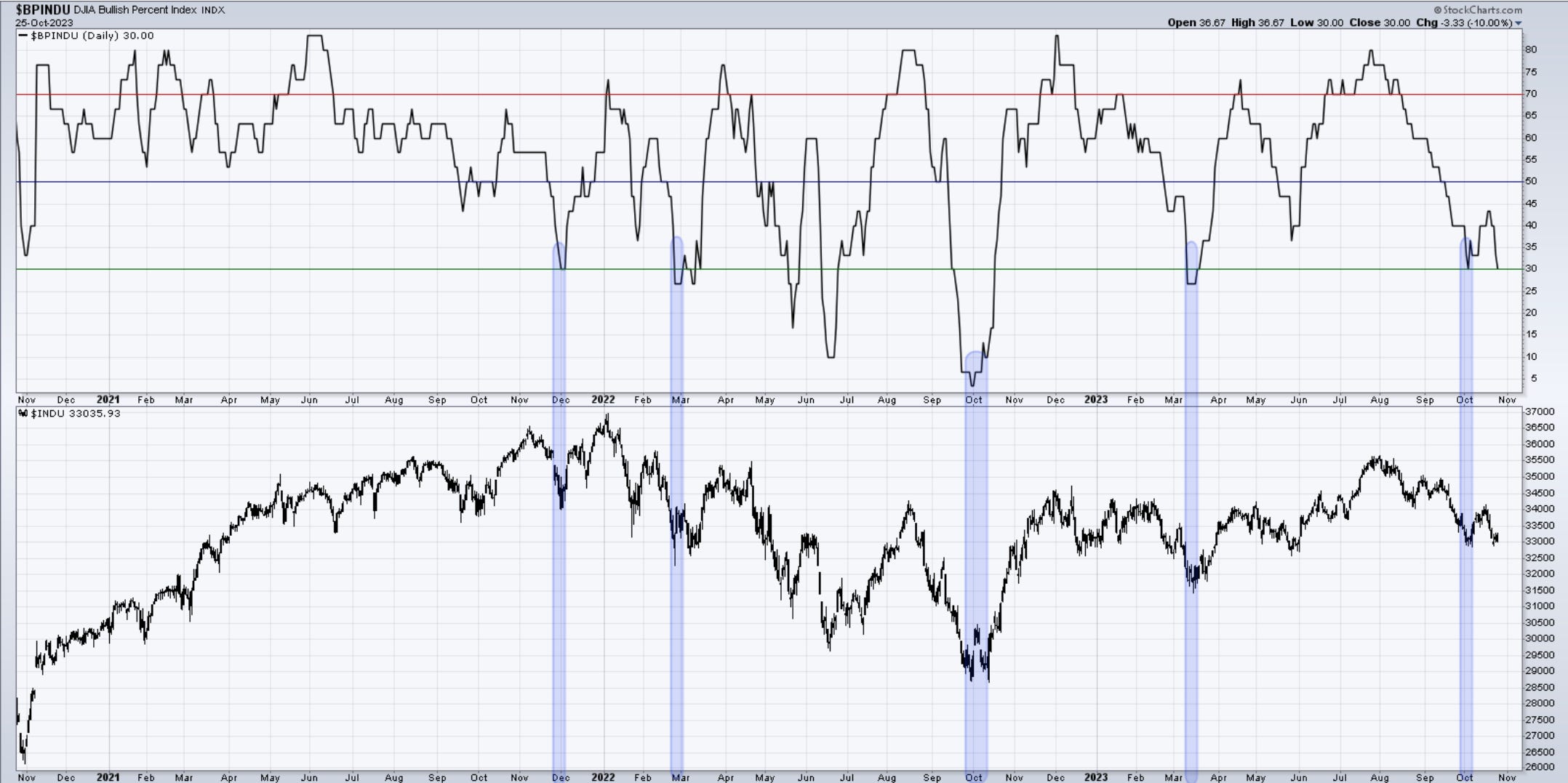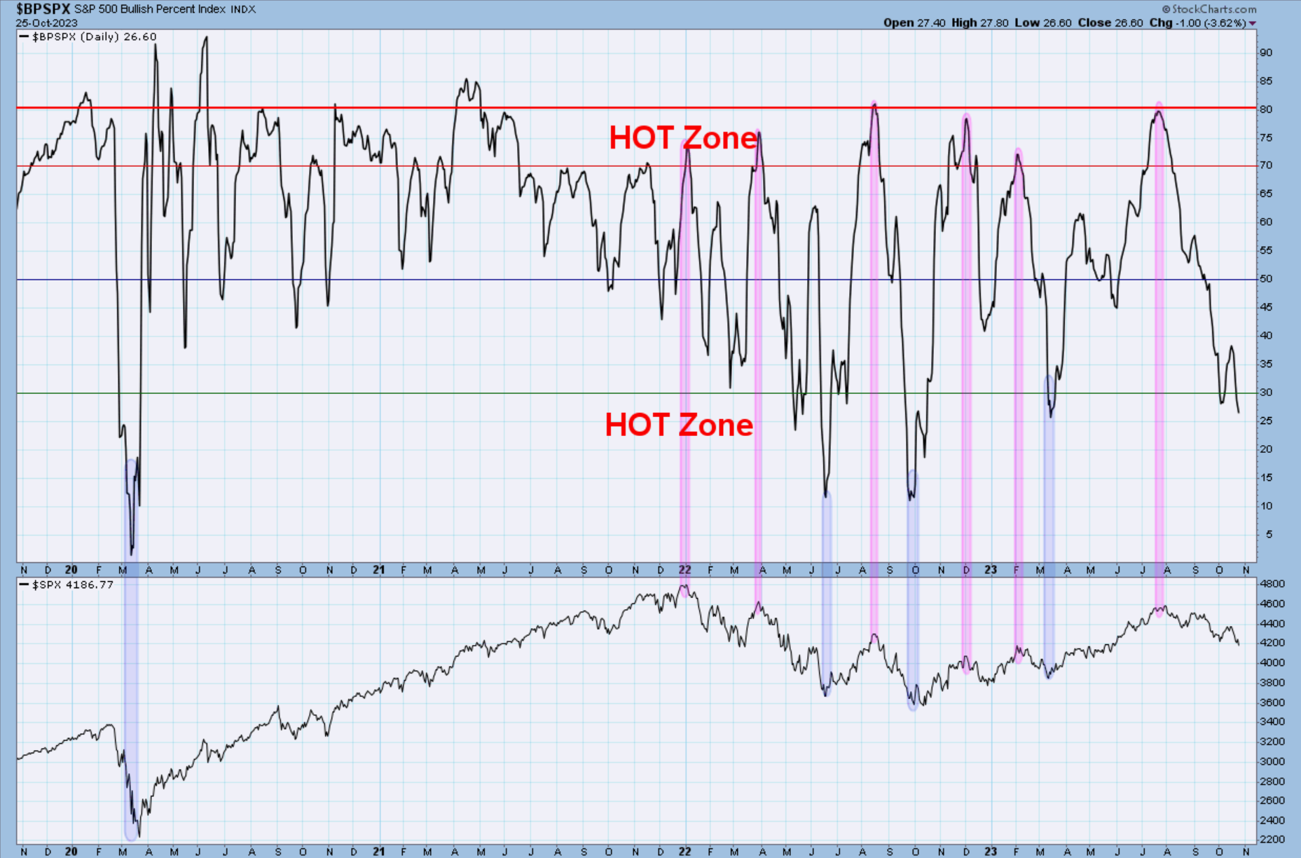 The BPI is back in the Hot Zone after the first 2 weeks of the month bounce. It pays to be careful about overstaying the welcome of short positions when this indicator is down here.