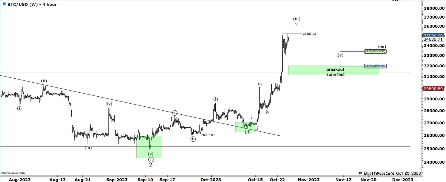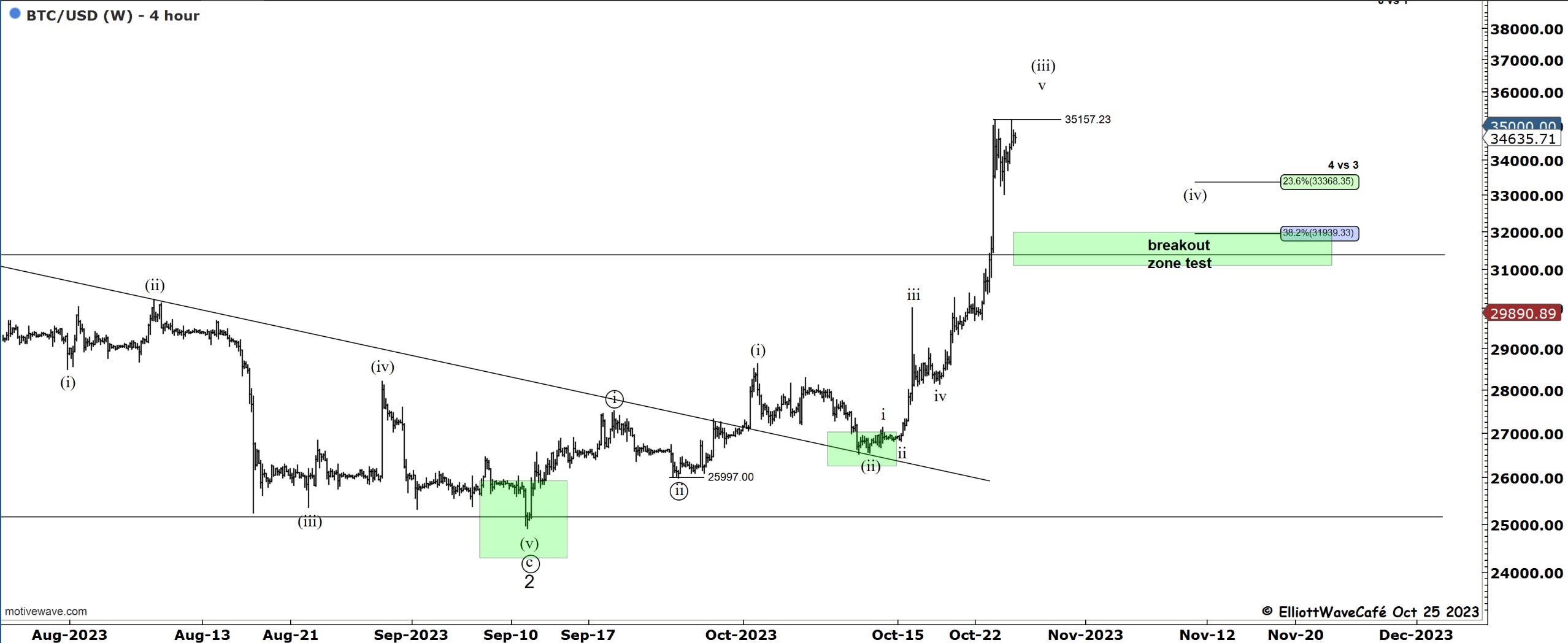 Depending on where wave (iii) actually terminates, we should have a 23 to 38.2% pullback. That puts us at the 32-33k zone initially. It should give way to the next opportunity for trading a wave (v) advance.