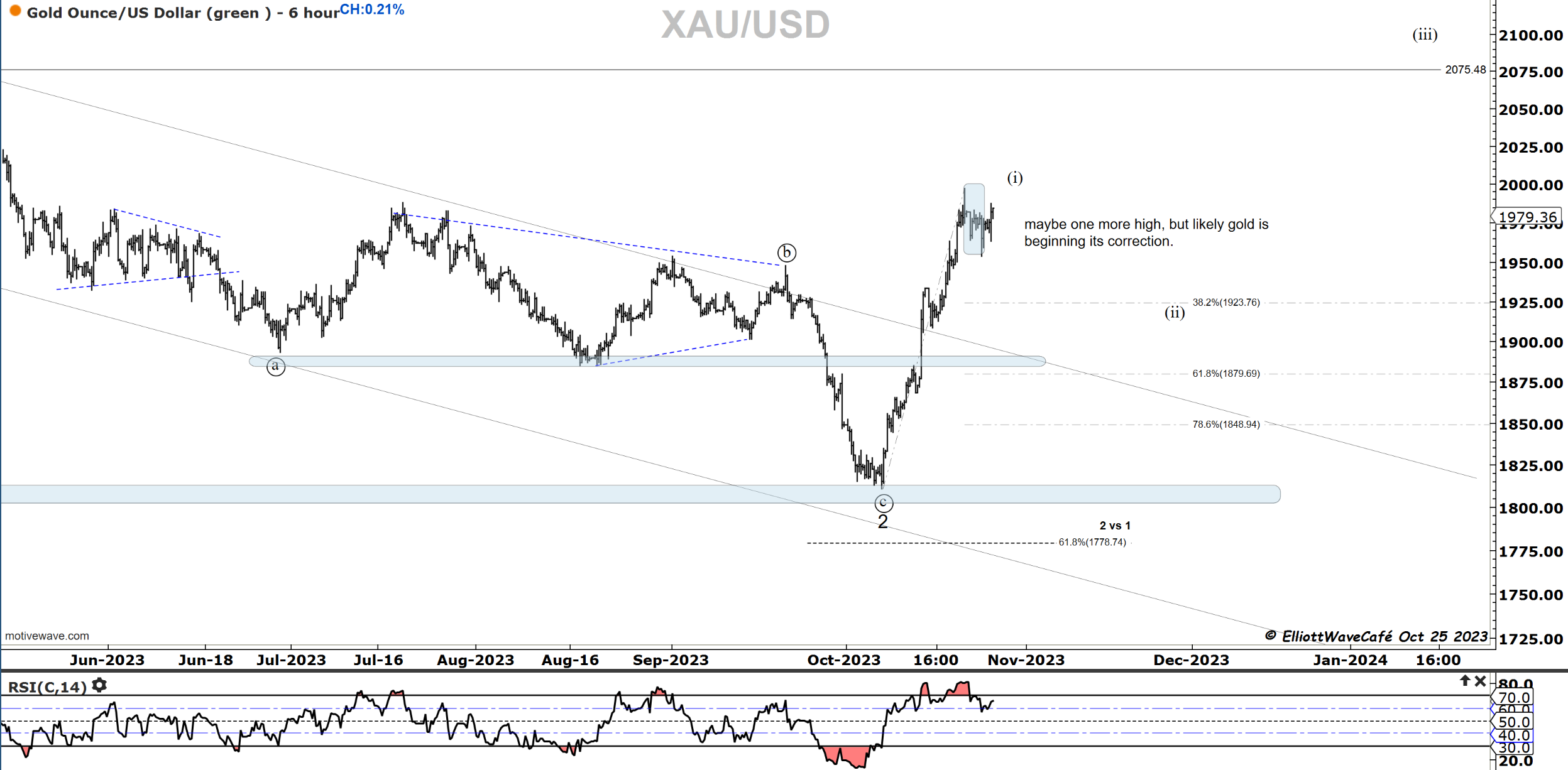 Gold continues to struggle here and it’s on alert for beginning the wave (ii) correction.