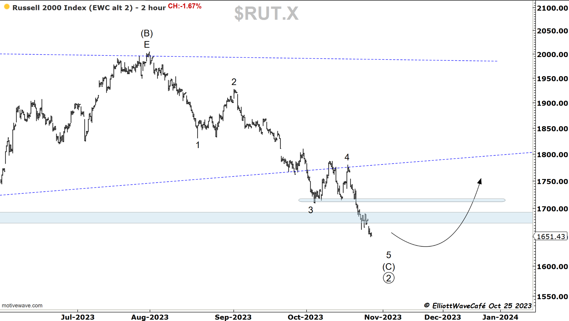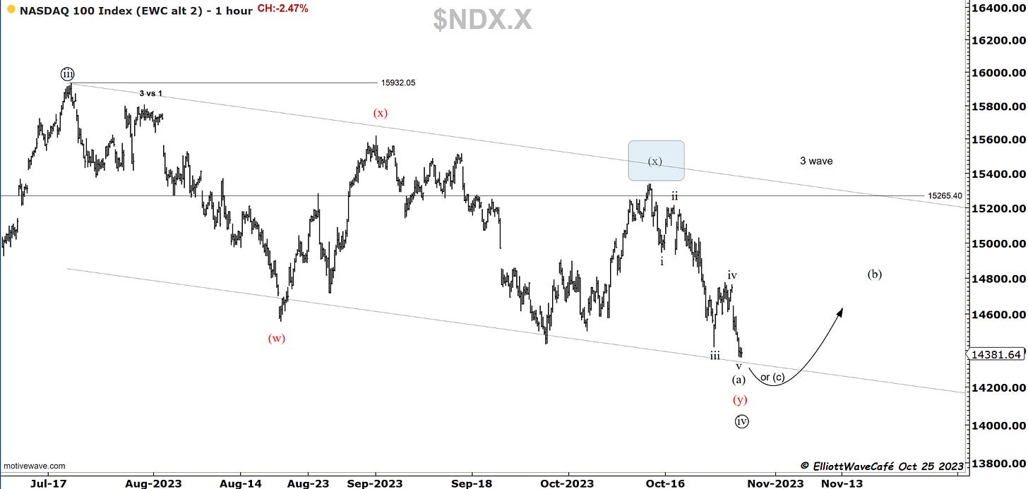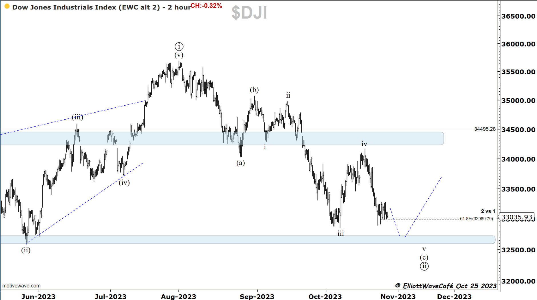 Nasdaq took a big hit today with a -2.47% decline. It is wave v of either wave (a) of (z) or (c) of (y). Bottom line, a bounce is expected next in either wave (b) or wave 1 of the next leg higher in ((v)) towards ATH.