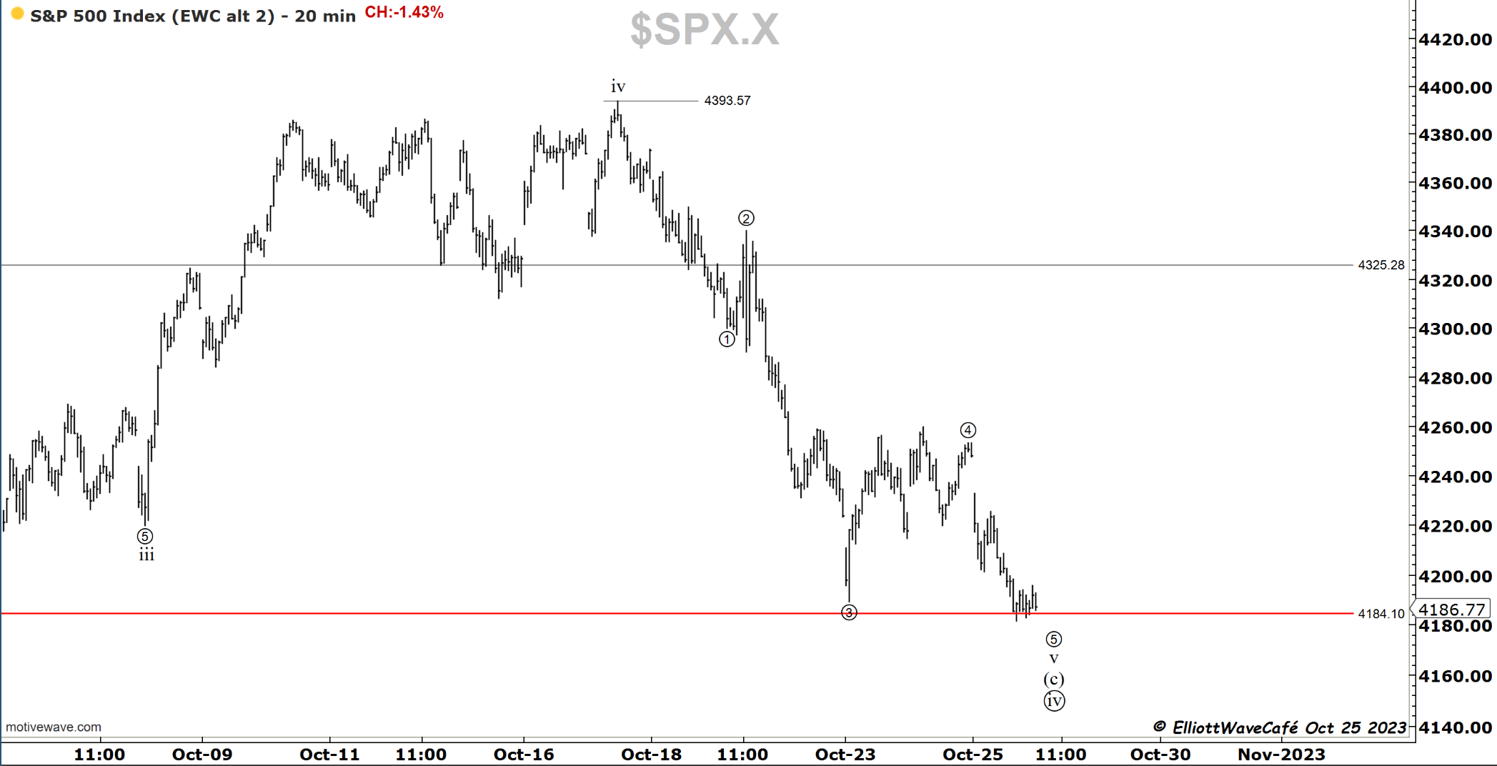 Here is a 20-minute chart of the index and the 5waves display. We could get a bit more selling tomorrow but it will be probably short-lived followed by a recovery back toward 4260 into next week. There is an unfilled gap up there as well.