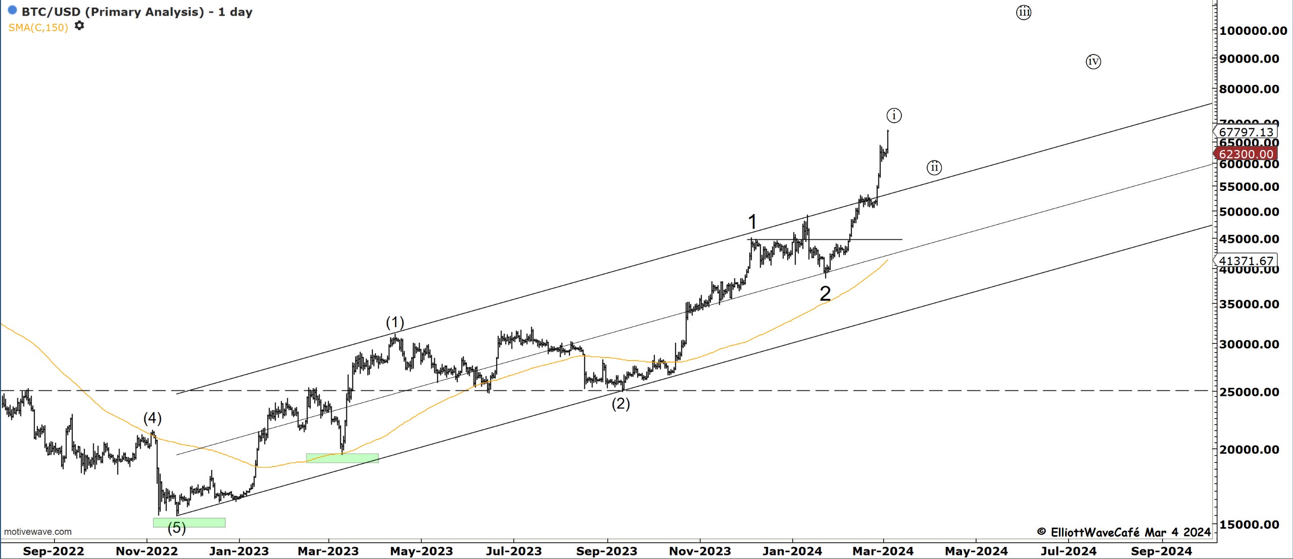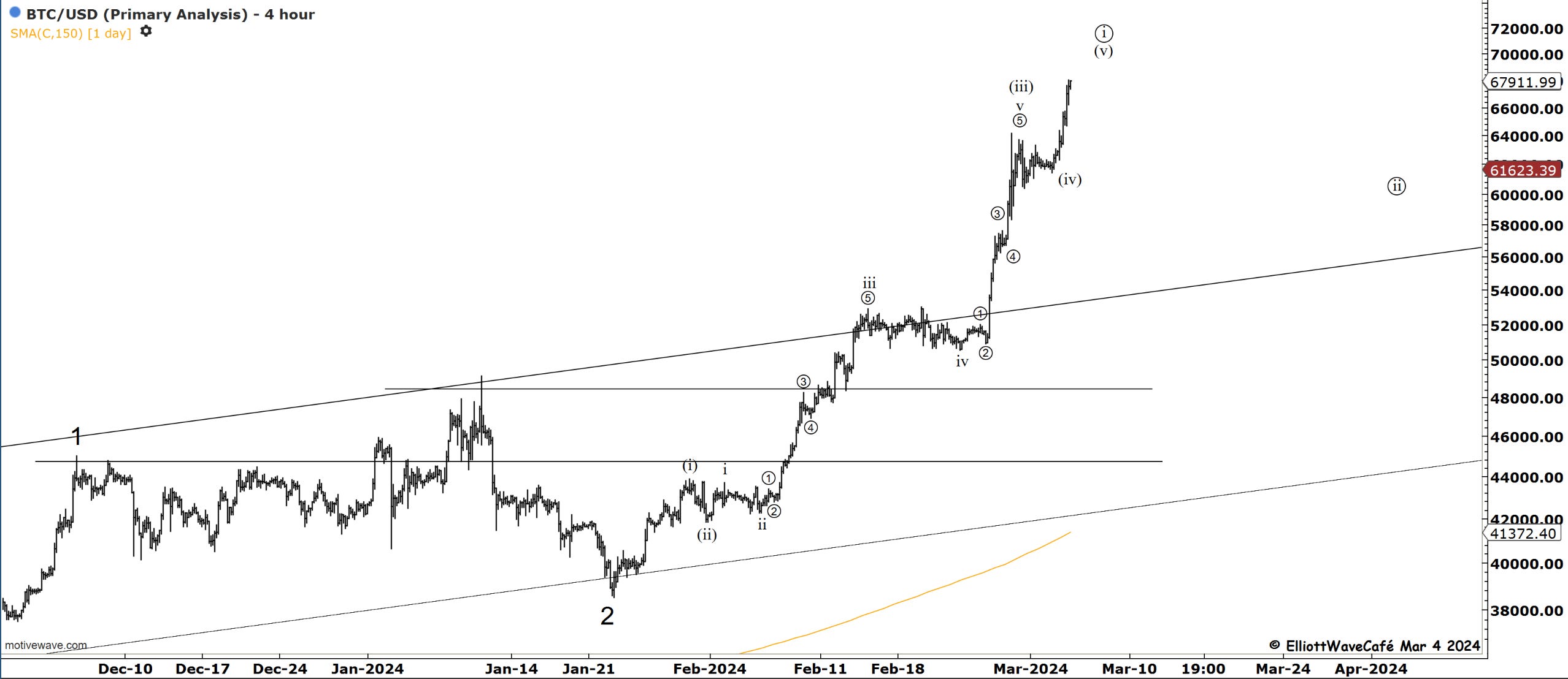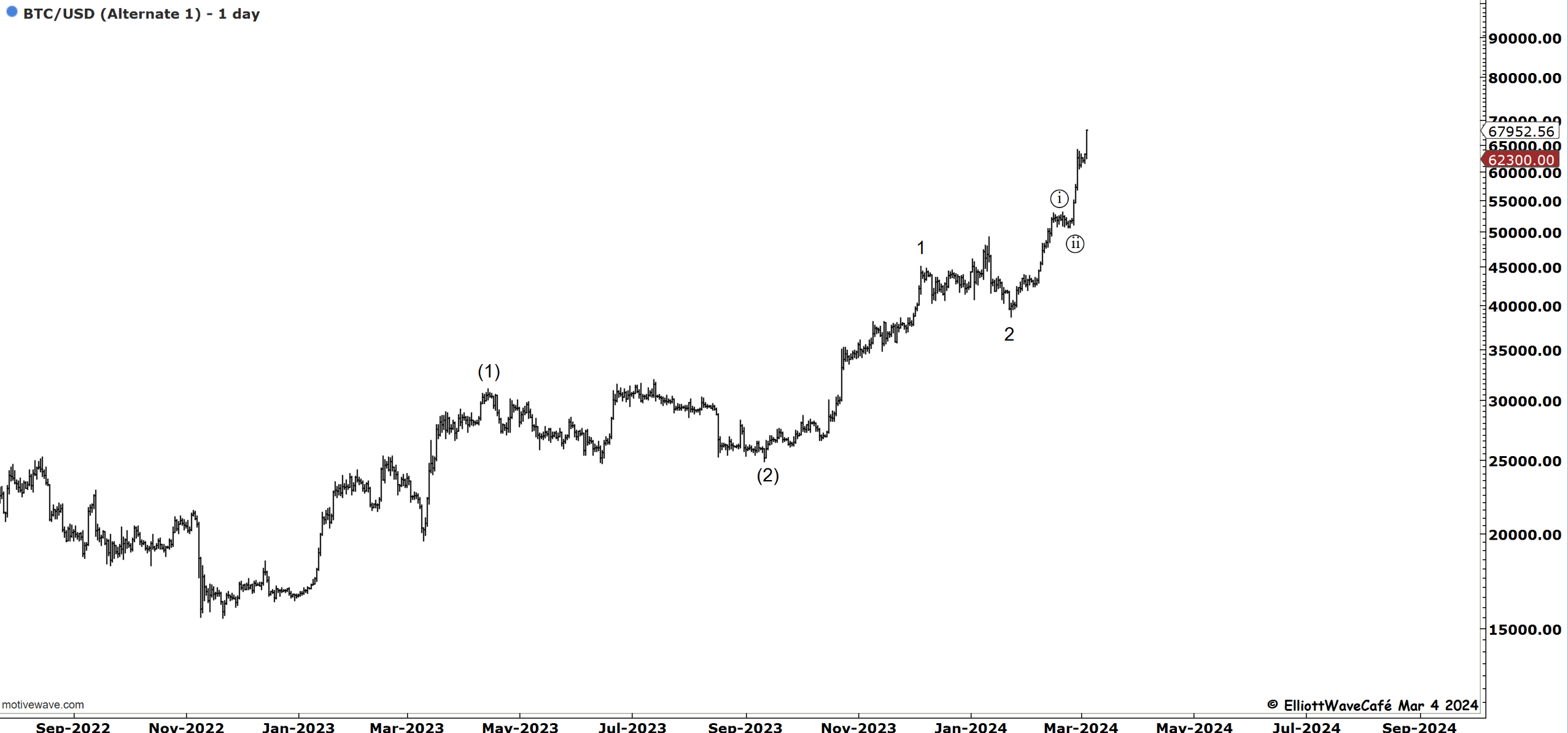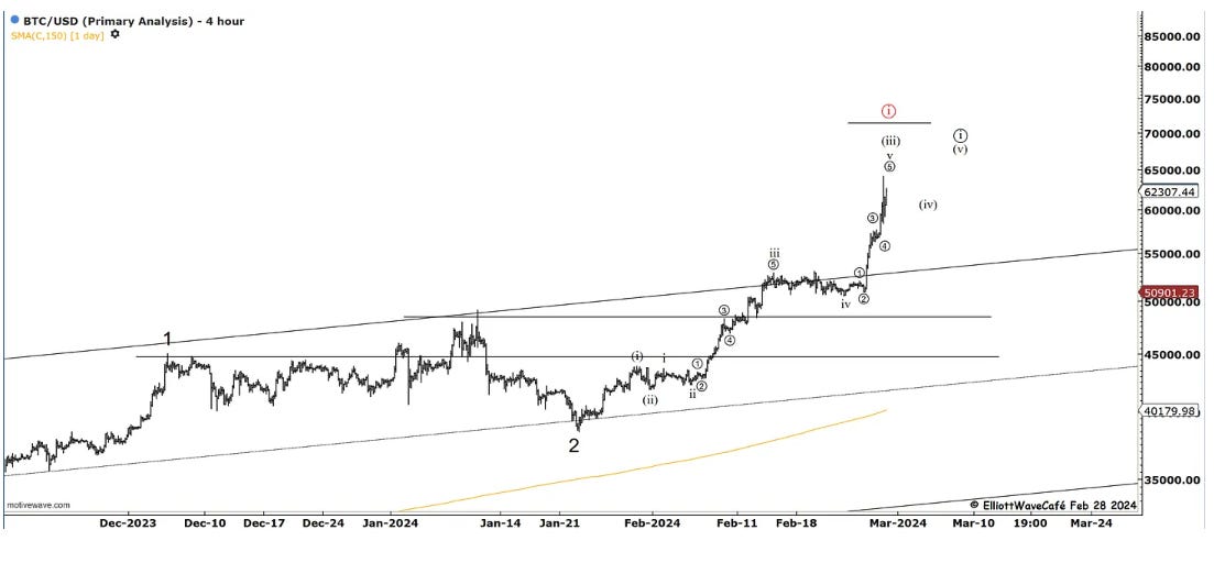 If we had a triangle in wave (iv) , the current spike is part of a wave (v). The market is hungry to reach ATH after more than 2 years. I would not want to be a hero here and make calls of when this will stop or if it’ll follow the wave ((i)) idea. In strong trends one must respect price and not make early assumptions of tops. The market will signal once it is ready to start correcting. Take a look at the alternate bullish count below.