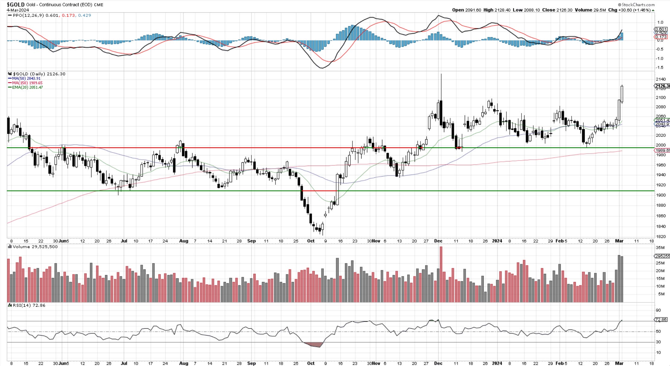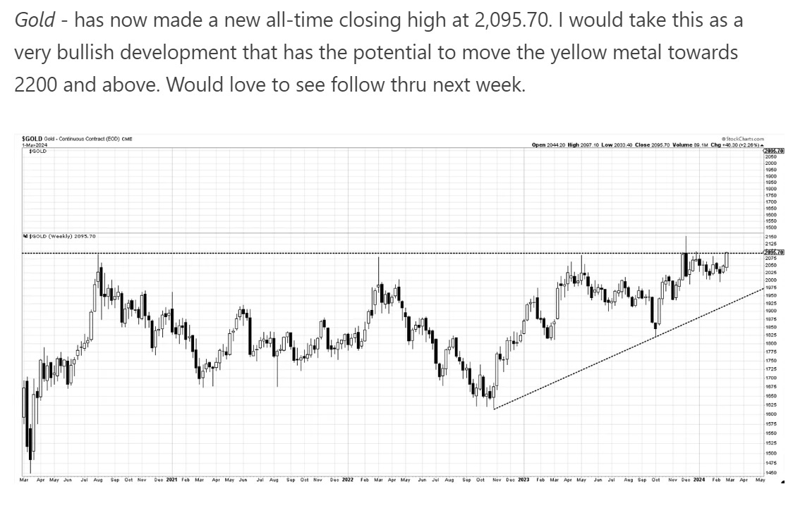 The breakout in Gold has arrived. The volume confirms it and we have now the highest daily closes ever. This is in addition to the weekly closes mentioned in Saturday’s report. Gold has disappointed before but one must consider this a good signal and look for further upside. As always, risk management is key. Consider a break back below 2050 as enough of a reason to revisit the bullish outlook.