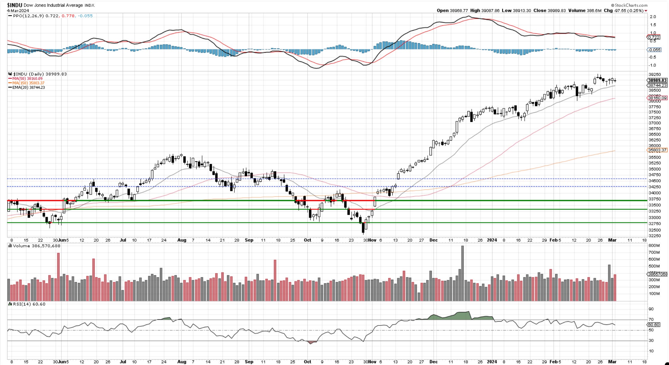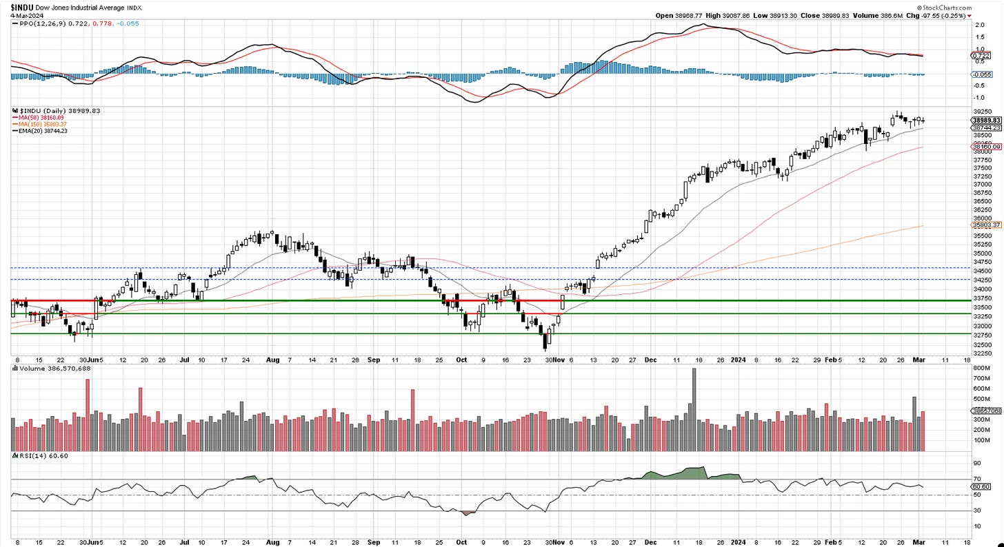 It has been seven days since the Dow broke 38,800. It only managed to get to 39,130 before retreating and sitting at old resistance. Looking at it as a pause in trend for now until we see some clear violation of lower levels.