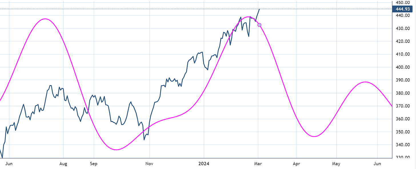 The cycle composite in the QQQ looks similar to the SPY and within a decent timeline for some sideways action or give-back.