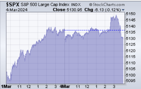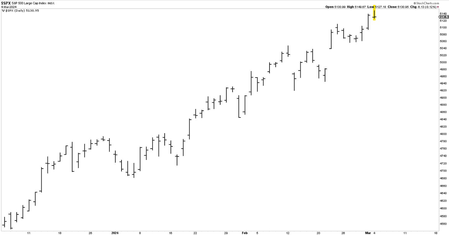 Today’s price action posts a small failure after an attempted rally. You can see in the clean bar chart below how the open and close are near the same levels with a quick thrust to new highs. A smaller chart below depicts the intraday moves. Everytime bears take charge and close lower at the end of the day one must pay attention. The evidence of trend exhaustion is still small, and we need to see more to start thinking a correction is upon us. A break of 5100 would be additional evidence.