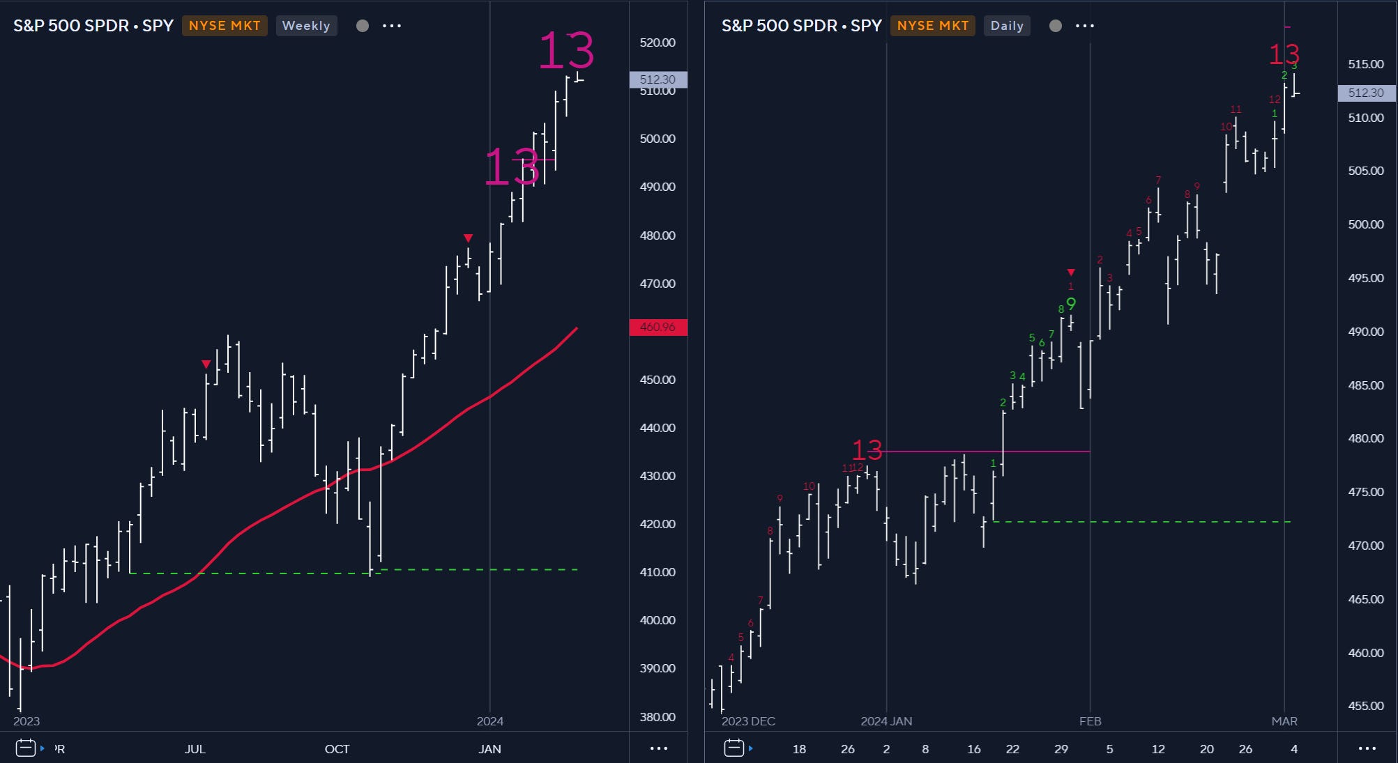 Another interesting “caution” signal comes from the DeMark indicators that point to buyer exhaustion on both weekly and daily chart with 13 counts visible on sequential and strict combo.