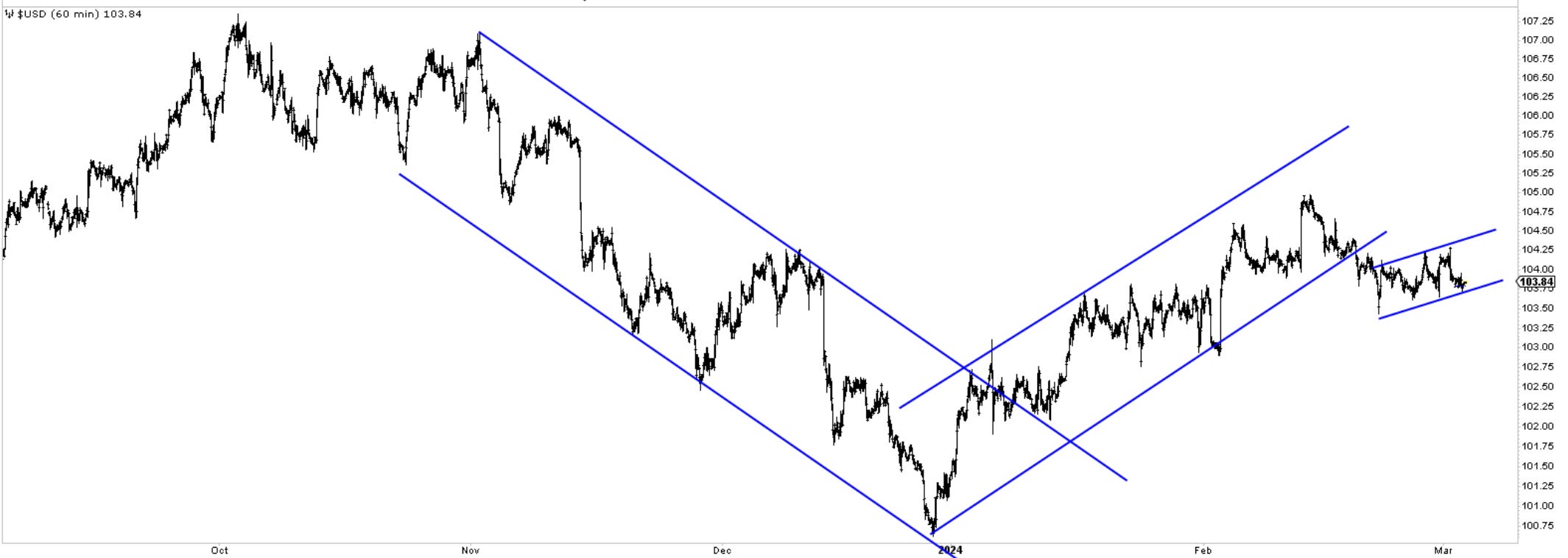 All I can offer on the Dollar at the moment is a technical picture based on channeling. The uptrend was violated, and we are now in what looks to be a small bearish flag. If we lose 103.50, the targets are 102.70.