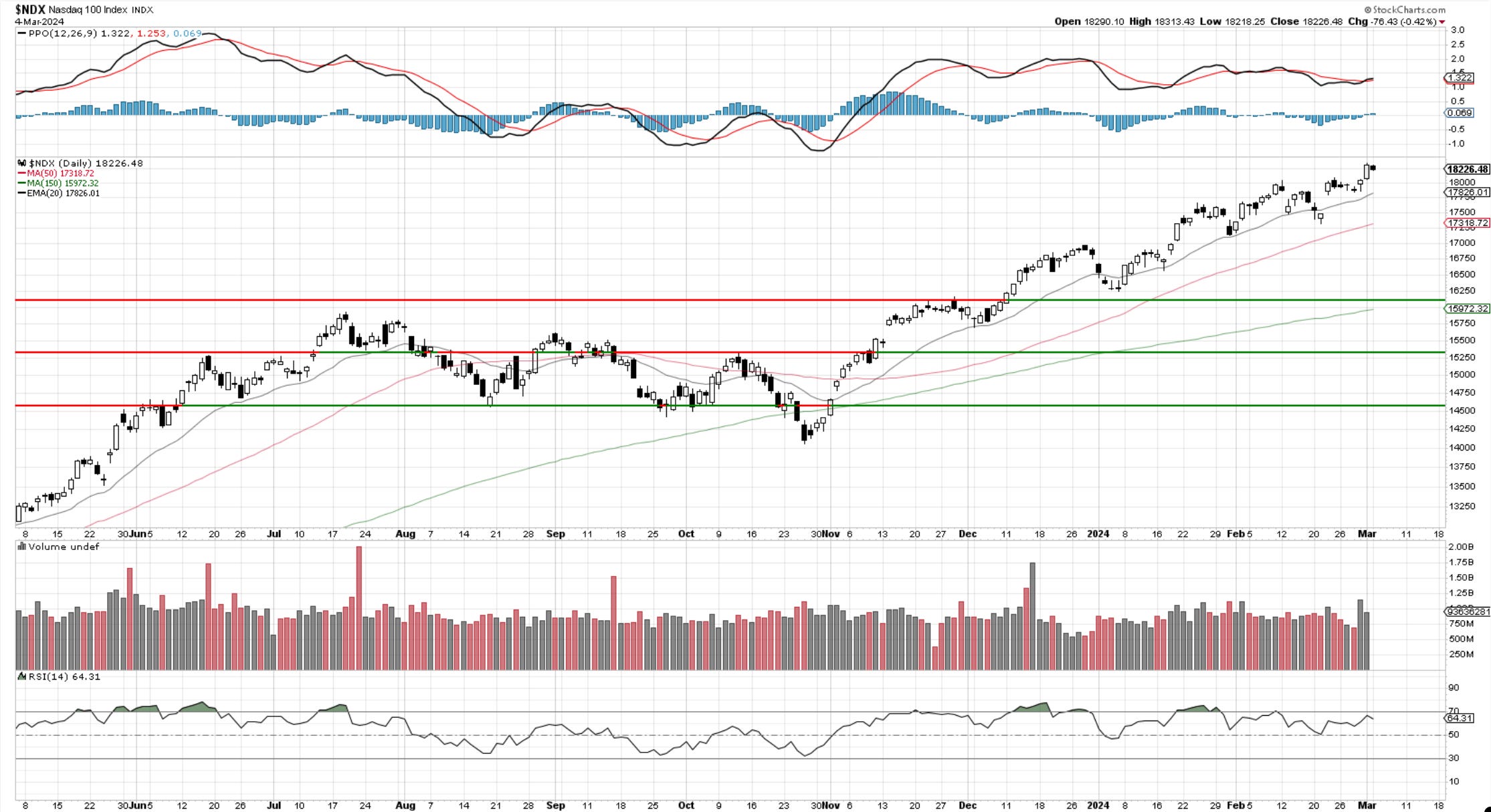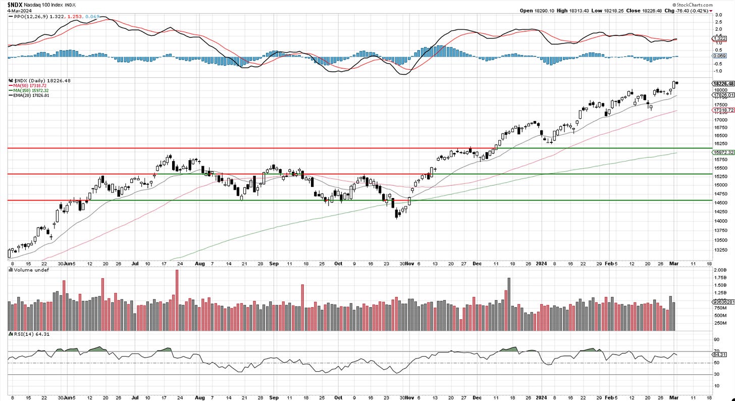 Stocks like TSLA, GOOGL, and AAPL had a pretty bad day but did not really derail the larger tech composite. We lost some ground in the close but until 18k gets broken there is not much to note here. Trends are intact.