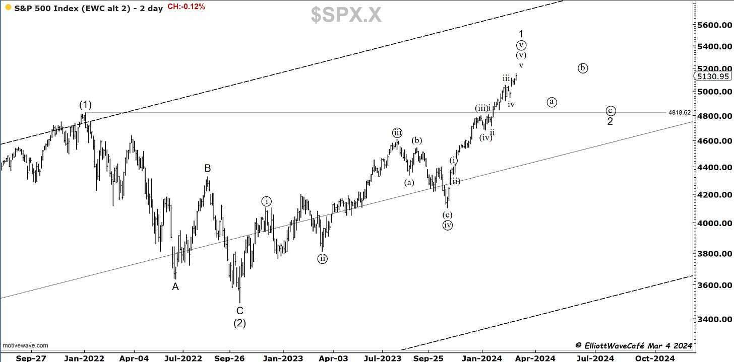 Running two simultaneous counts at the moment. It is hard to make trading decisions based on the current mix, so the best I can do is observe and look for evidence of them working or not. In the first chart the idea is that we’re in the middle of an ongoing trend, while the second is pointing to exhaustion in a fifth wave. A very hands-on active trader following the trend must continue to raise stops above key levels and know his invalidation levels.