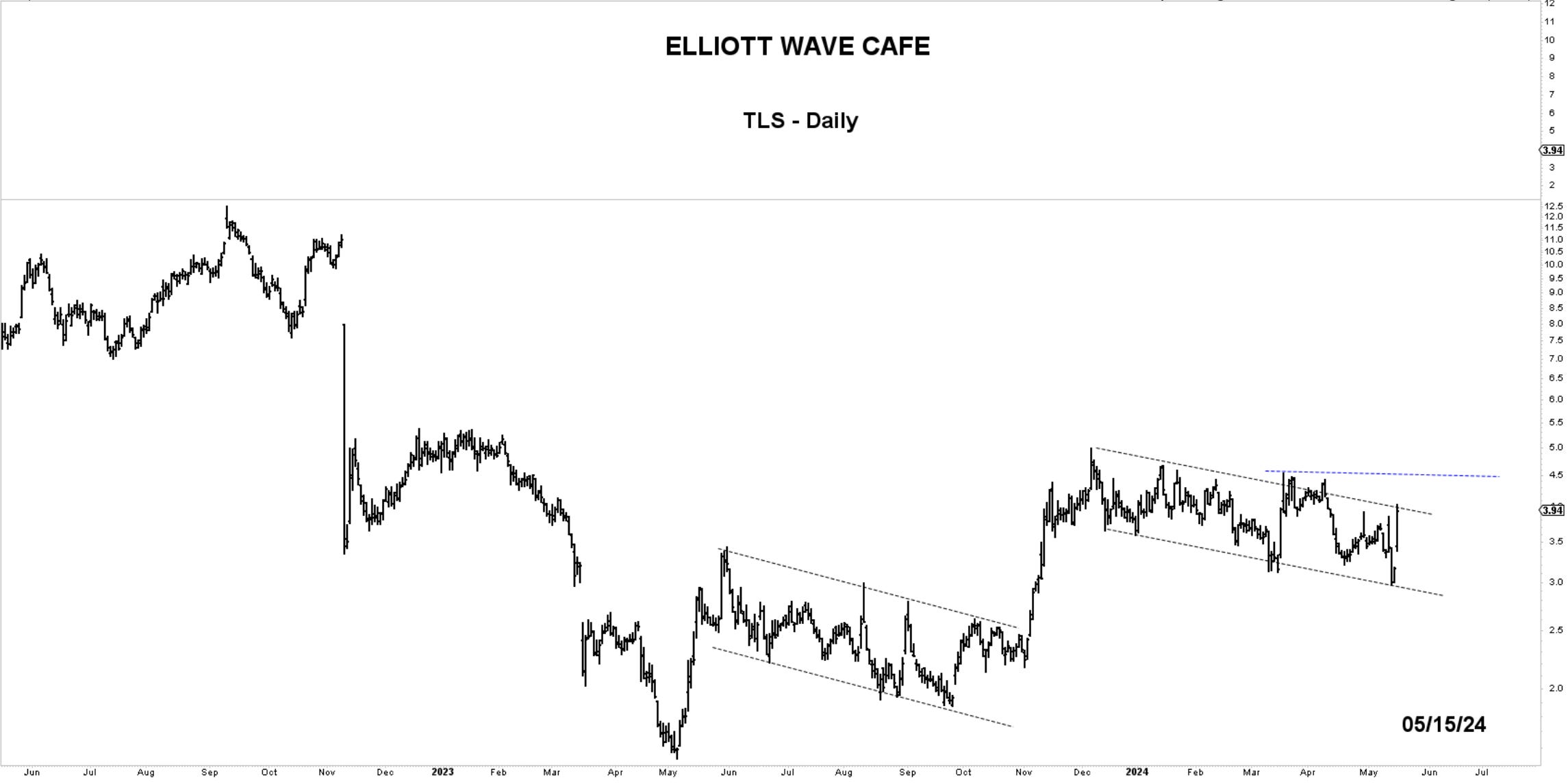 Chart of the Day—TLS—Two obvious corrections set within channels. I'm expecting an impulsive move next. Above the blue horizontal line, longs would be triggered.