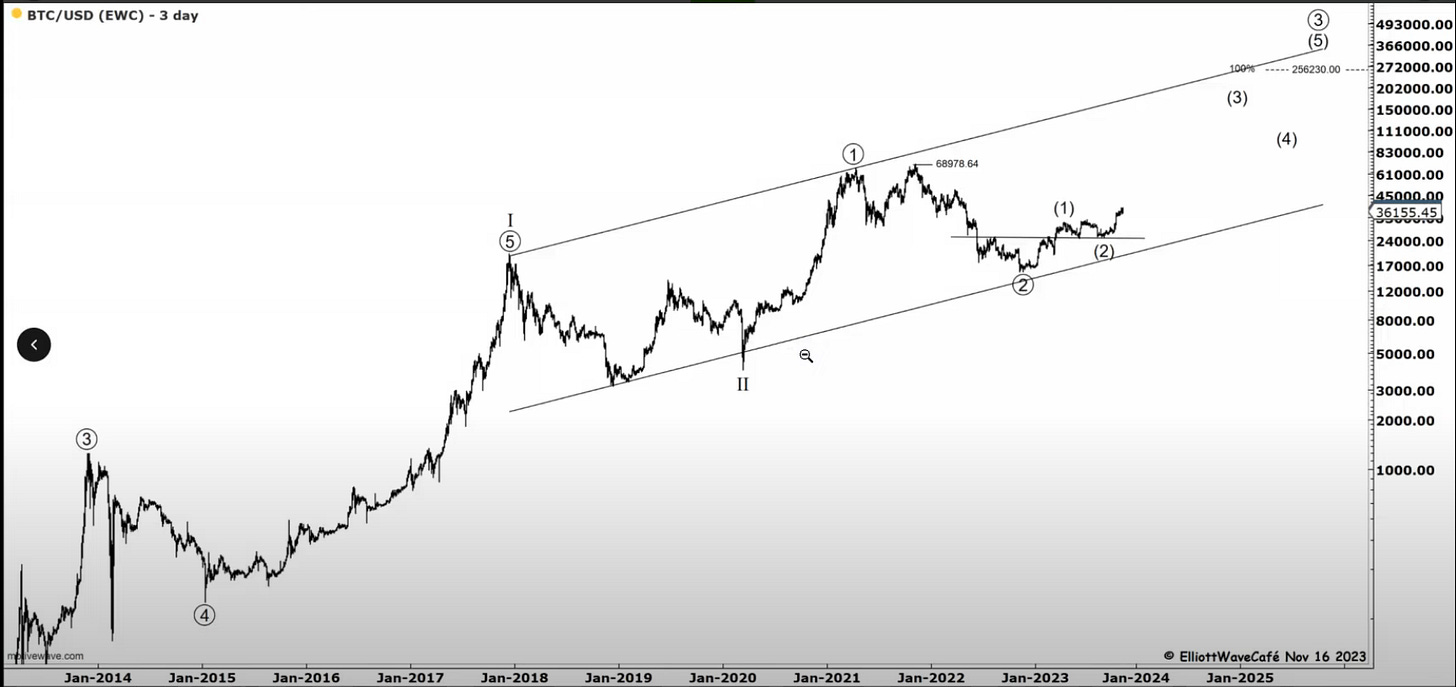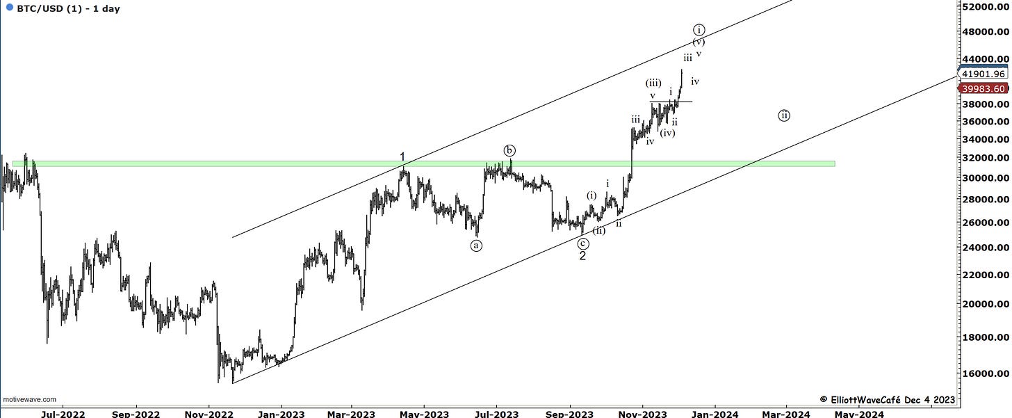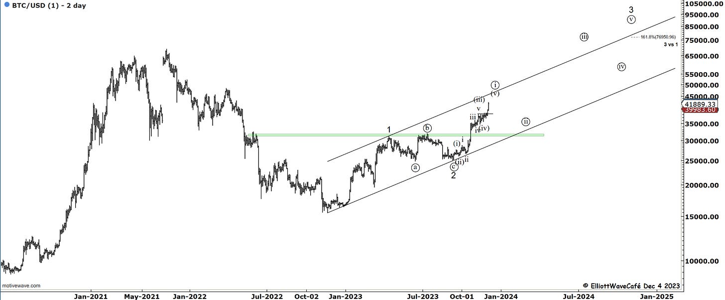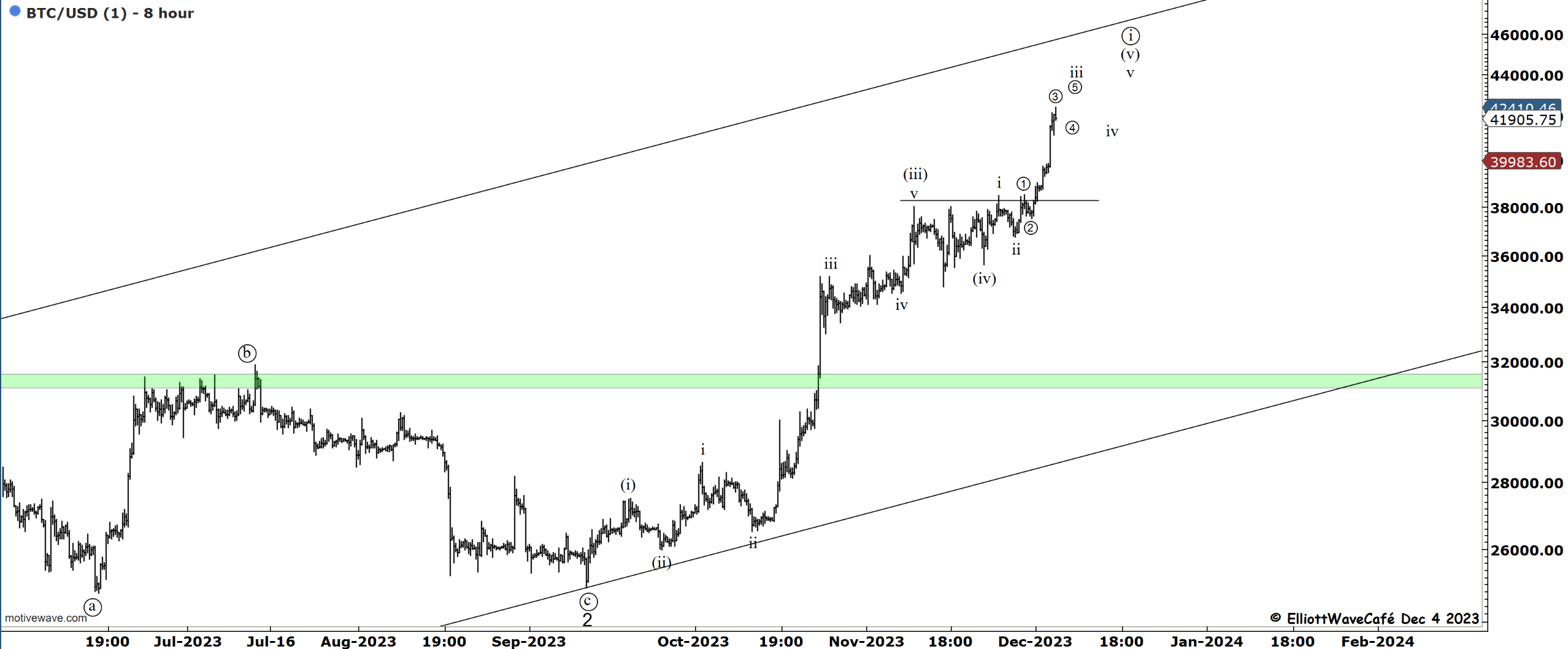 Over the weekend breakout sent BTC towards 42k. It’s a final 5th wave thrust ahead of a corrective period. The bounce was higher and stronger than my expectations near 40k. The three charts below describe my thinking for the upcoming price action. Since we seem to be in a higher degree wave 3, one must be aware that pullbacks could be shallow and short-lived. As beautiful as a wave ((ii)) would look on the charts, we might not get it exactly like that. Shorter term if my subdivisions are right, we still need to grind higher a few more legs to complete the sequence. A move back below 39k would suggest the impulsive leg in wave ((i)) was completed.