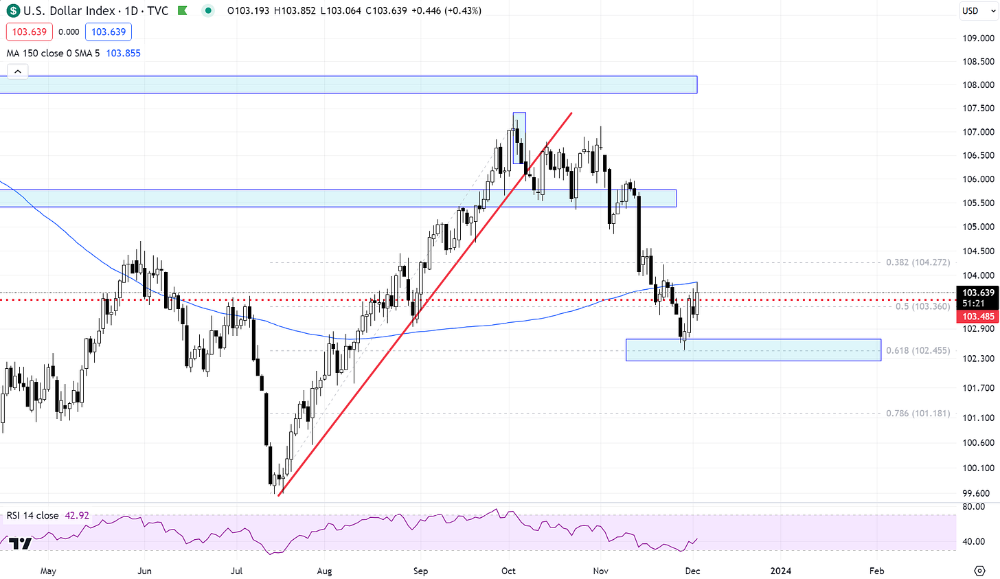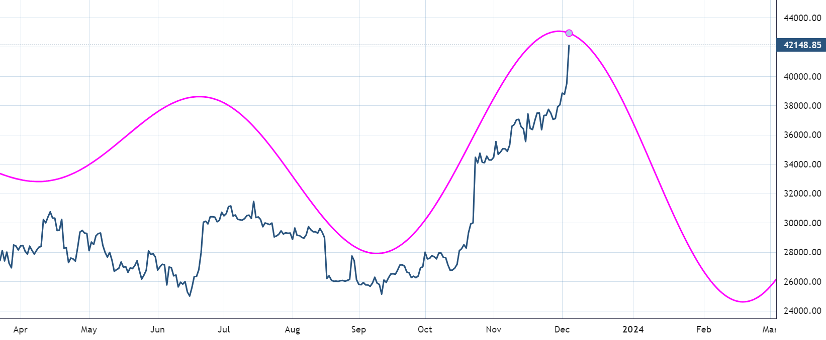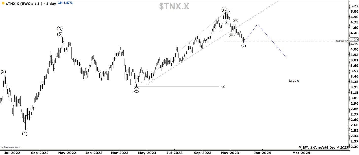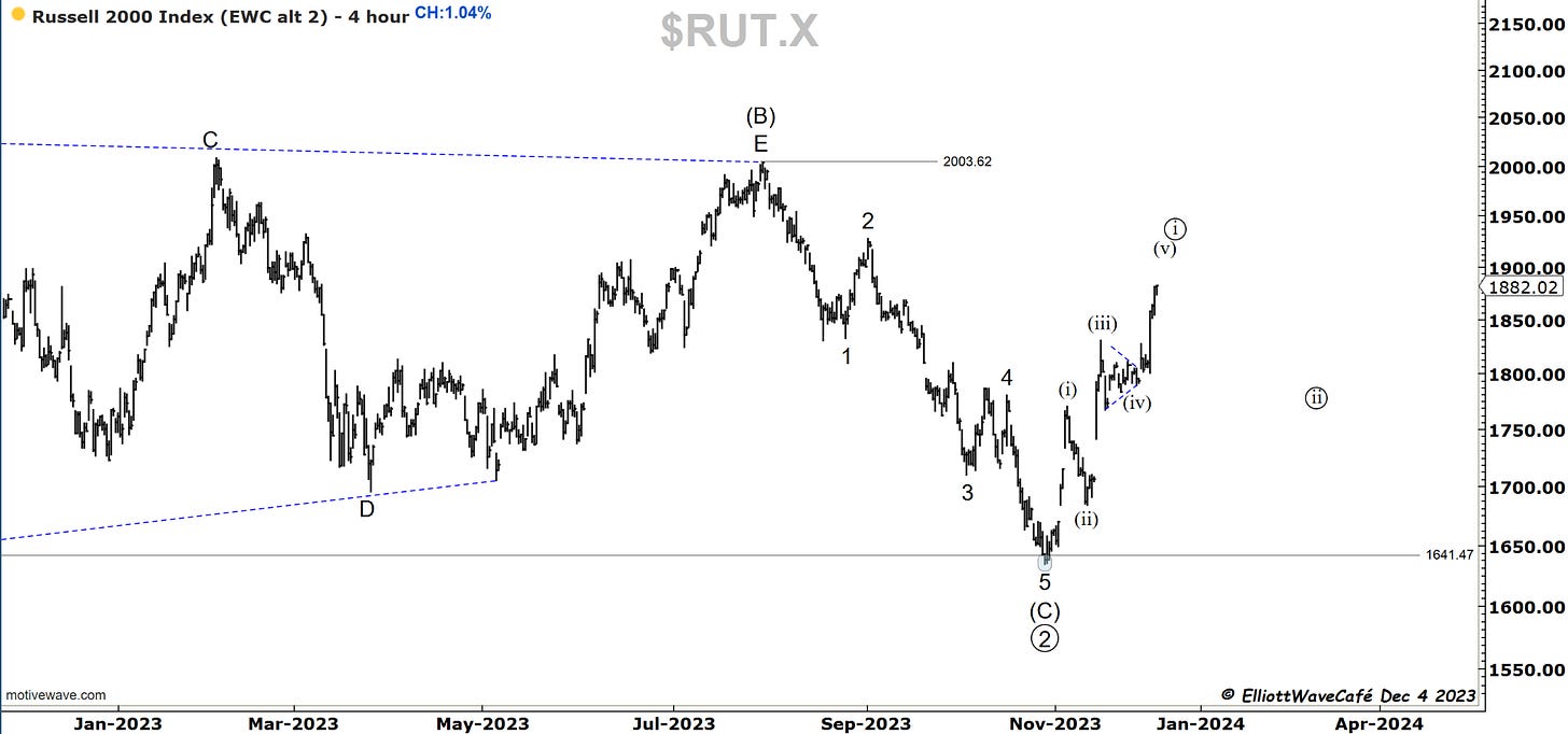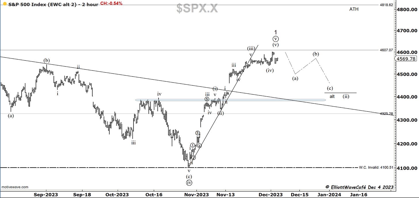 On Friday, Dec 1st, the index pushed higher one more time but stopped just below the 4607 highs from Jul 27th, 2023. We have been discussing the wave five topping formations here for the past several updates. What is also true is that the markets have been struggling to advance since roughly Nov 20th. My view stands that it is right to correct here after one of the strongest months in market history. Today we got a hint of that with the index dropping about 1% from the highs at one point in the session. The next 2 weeks have plenty of economic data, and you can’t blame traders for being cautious or pulling back on risk-taking. Many internals I follow shows sentiment exuberance along with the palpably excited trading of junk stocks and crypto. The cold showers are around the corner. Uber was accepted in the Sp500, and the stock sold off today. The Mag7 have been struggling for a couple of weeks already. Yes, we’re trading from large caps into small caps, but that’s never really sustainable in my view.