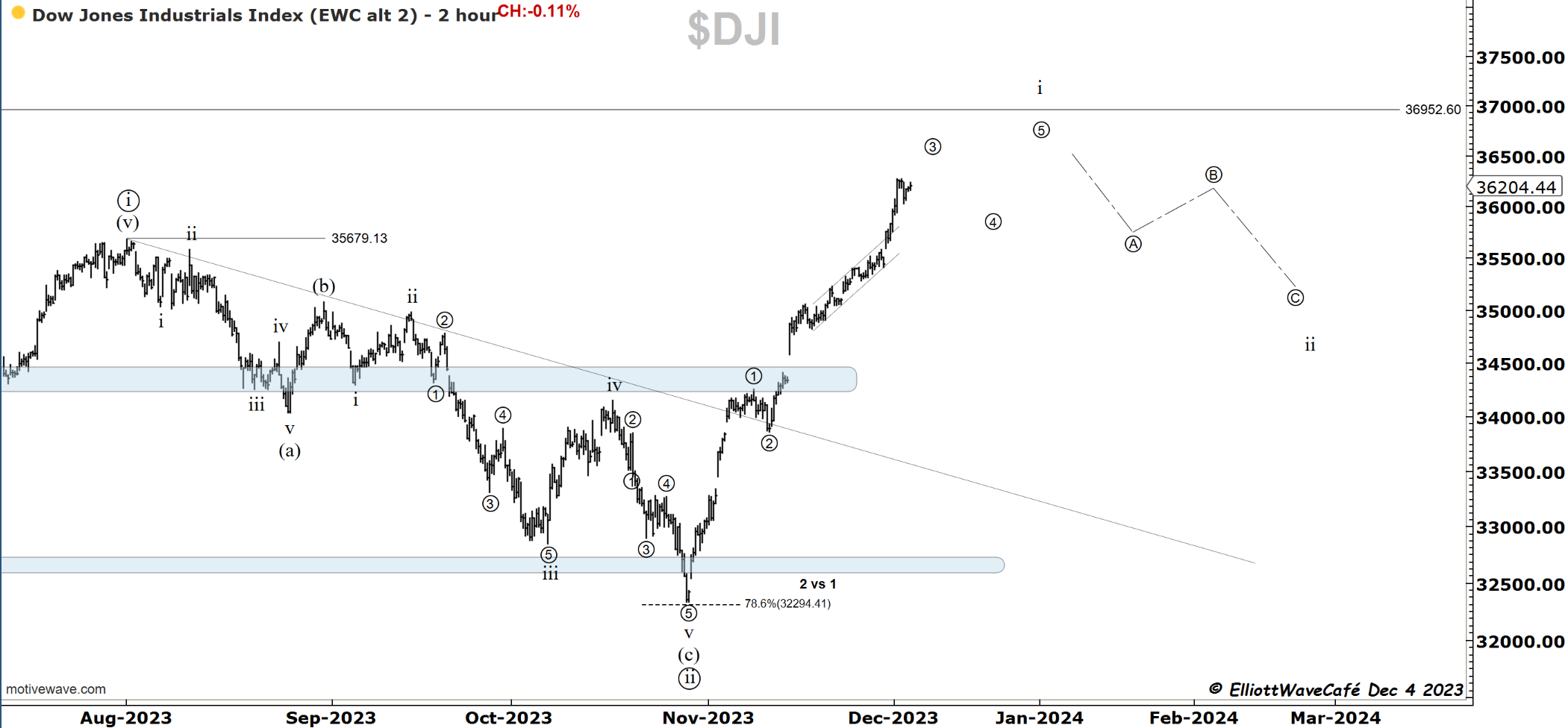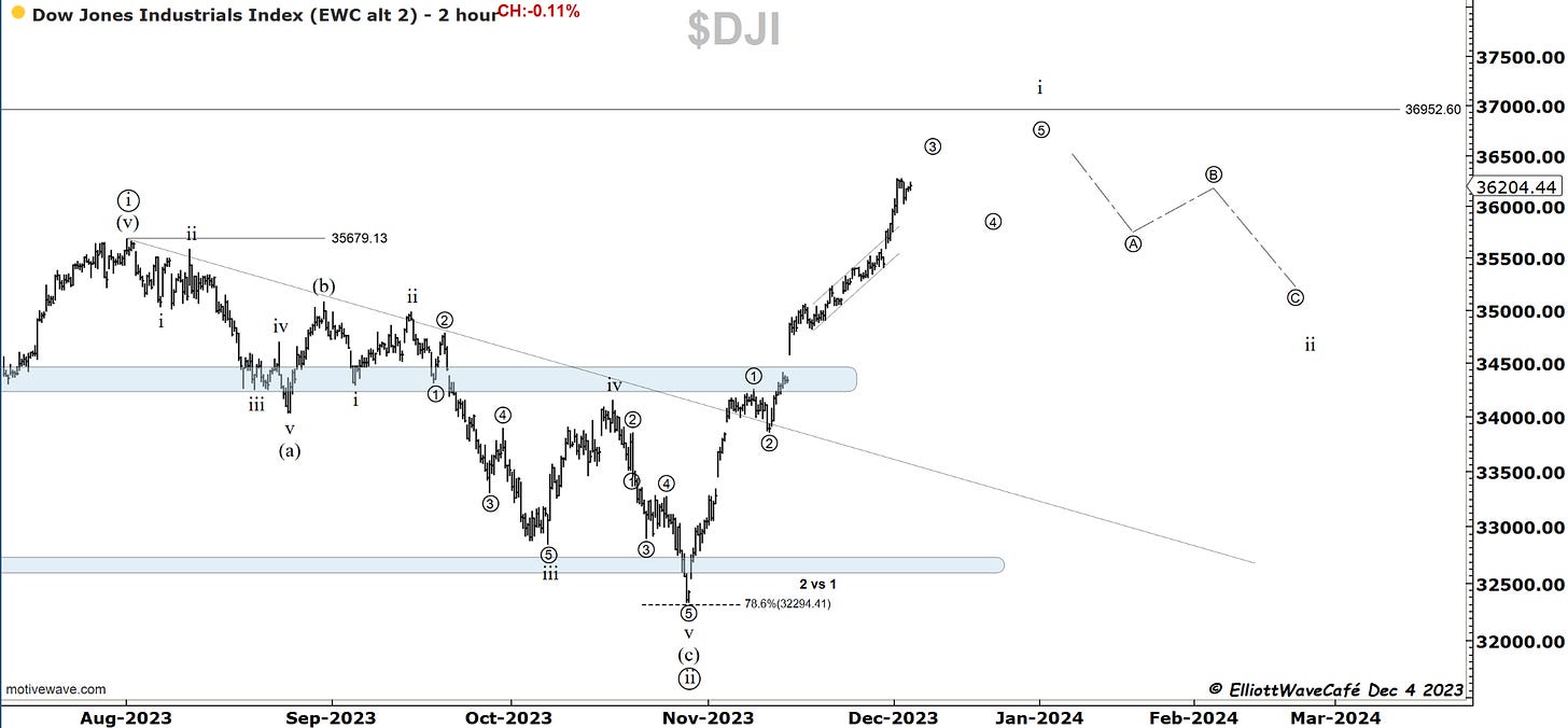 By surpassing 36,043 and extending, the original 5th wave approach had to be dismissed. A wave ((3)) seems more appropriate which once finished it will give way to a 4th and a 5th before a correction starts. Dow has been quite strong and it shows by the count stage vs the other indices.