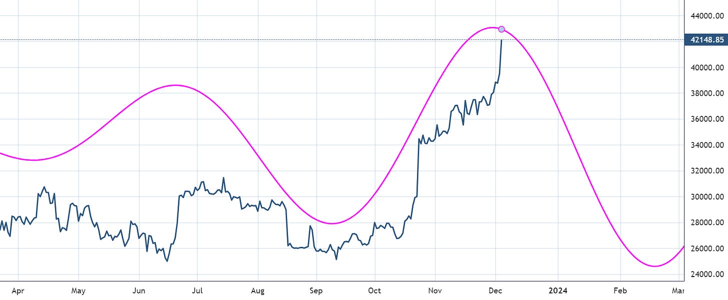 This BTC cycle is still in the back of my mind. It might just start after the top of the trending channel is hit above. I would tighten stops and take partial profits if that fits your trading strategy.