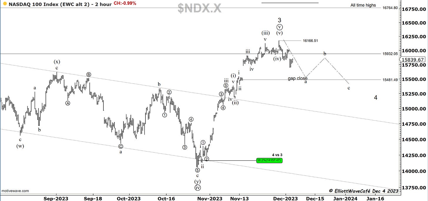 The Nasdaq topped the first on Nov 29th. It was the hardest hit today but managed to recover some. I continue to look for that gap close near 15480 and a correction that should unfold timewise for at least a few more weeks. At the larger degree I see it as a wave 4, subject to change depending on progression.