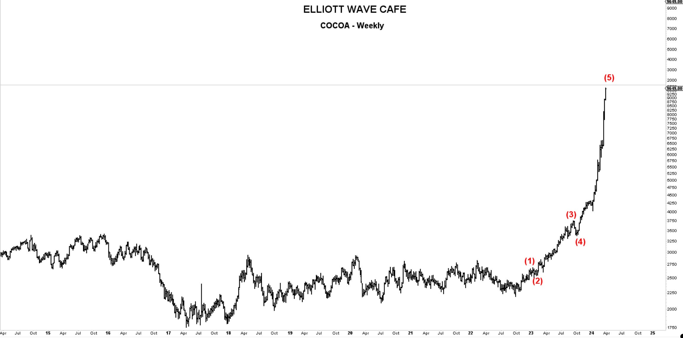 Chart of the Day—COCOA— Not a market I follow closely but it’s worth pointing out the simple motive wave structure it displays. Commodity markets are notorious for developing strong 5th waves and here we have a prime example of that in my view. This market, just like lumber a few years ago, will fall aggressively upon the completion of this 5th wave. I would not suggest picking a top here, but wait for evidence of topping and with the risk of missing the initial move lower, one can use the subsequent rally to initiate a trade.