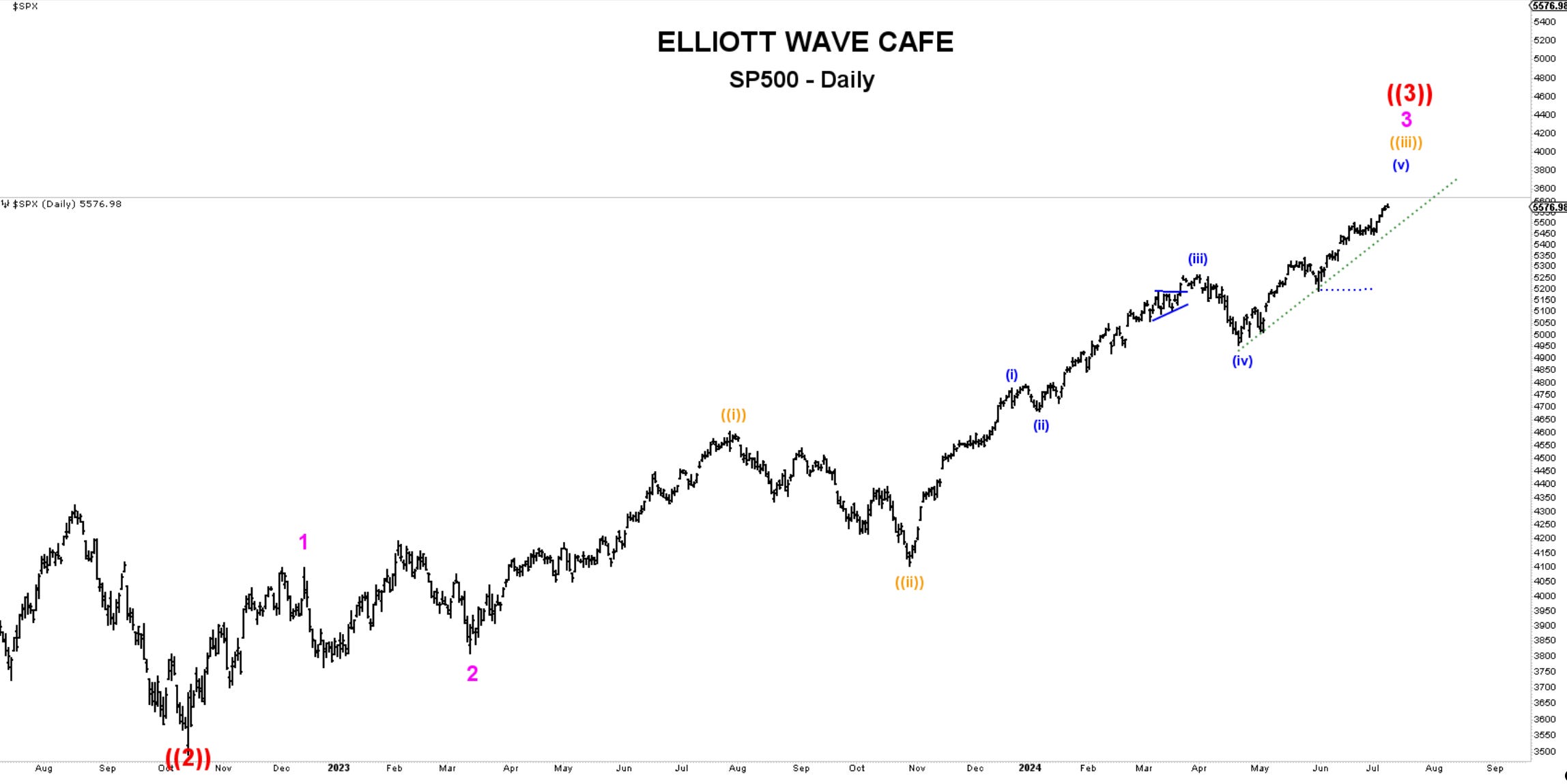 The SP500 remains in an upward trend working a wave ((iii)). While the current move from April 19th low can be considered a fifth wave, the evidence of its completion is nonexistent. A break of the green trendline along with 5440 lows would be the initial indication a corrective move is taking place.