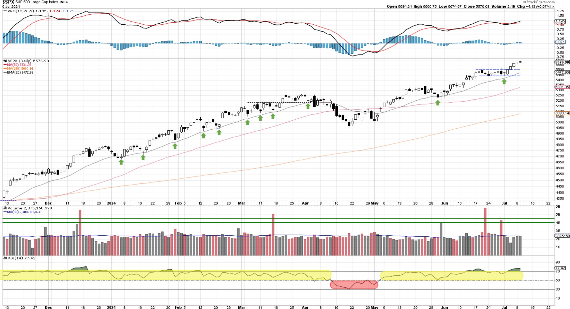 On the technical page, we continue to notice several things that continue to give confidence in the existing trend. Price is making higher highs and higher lows, it is trending above all key moving averages, rsi is in the bullish territory, while PPO is steady. First support comes in at 5500. We are trading 1.9% above the 20day, 4.6% above the 50day and 13.8% above the 200day.