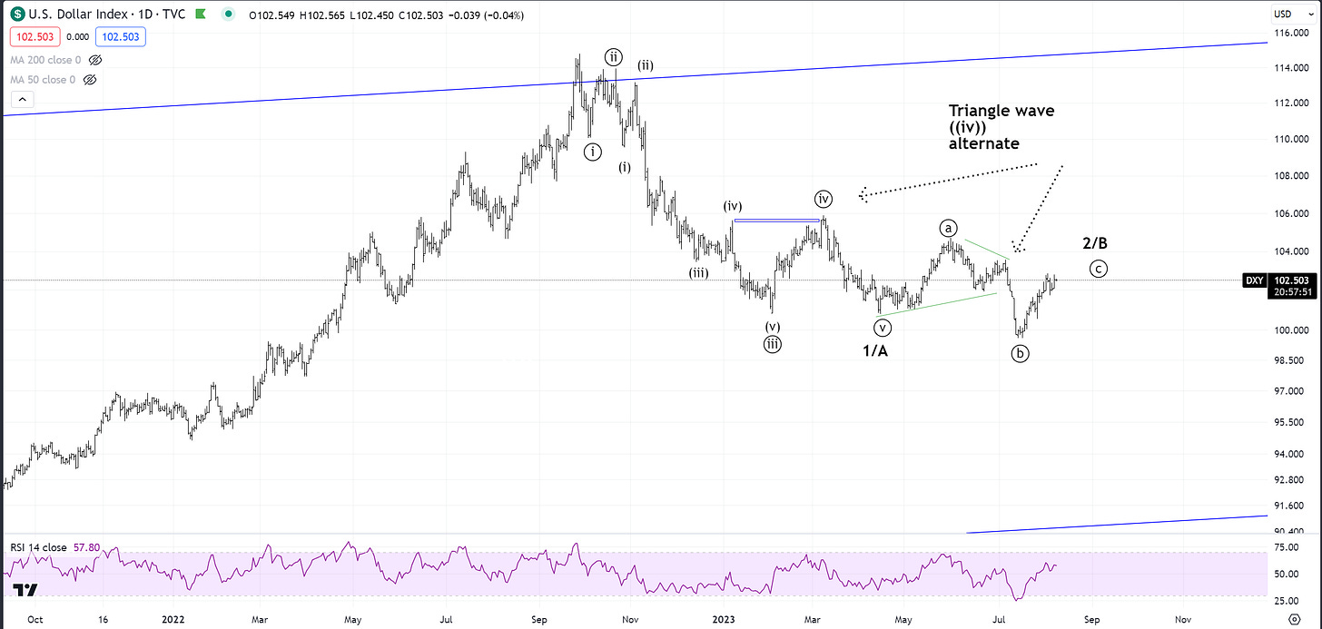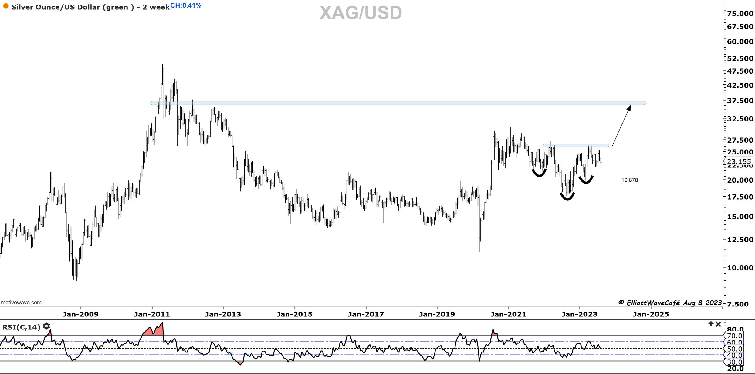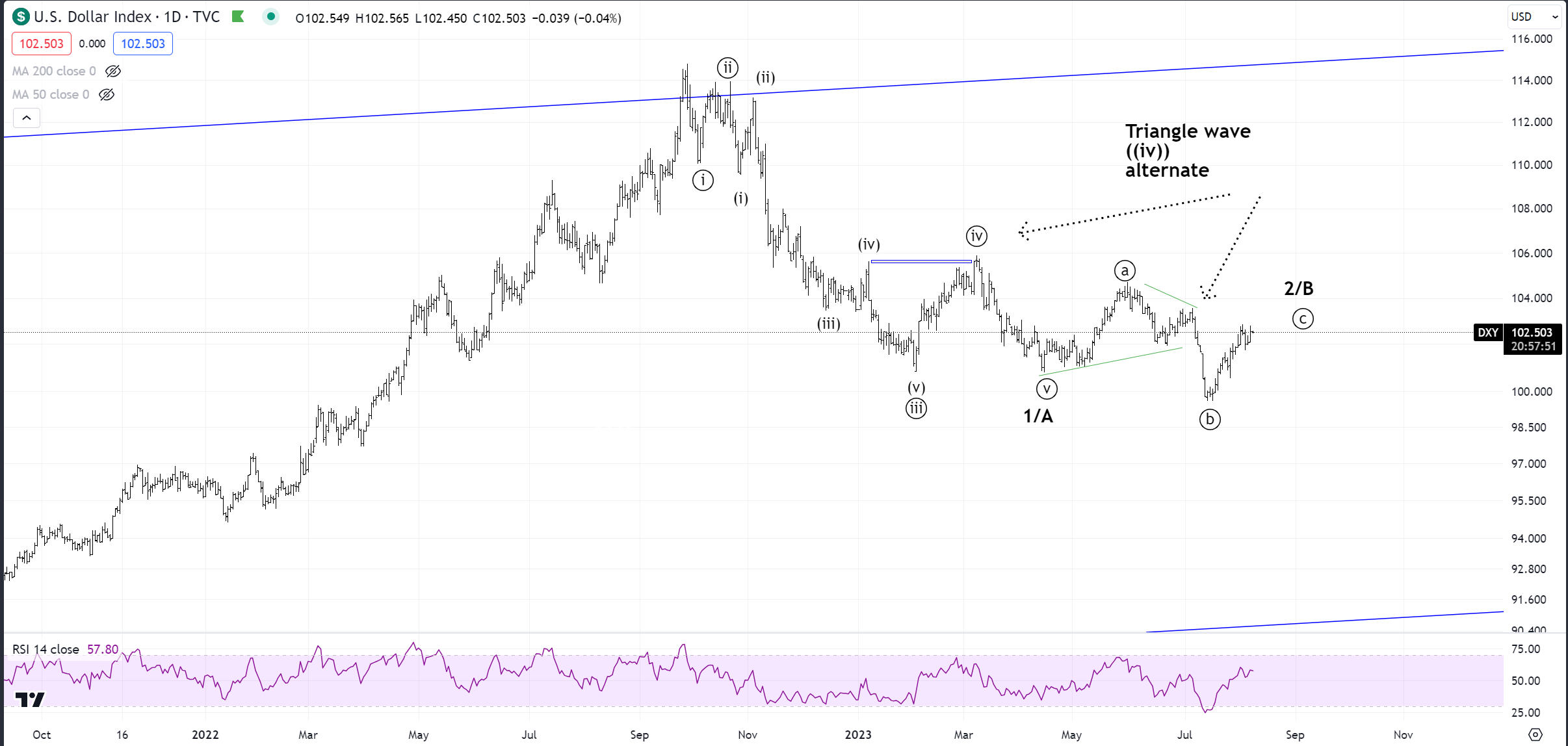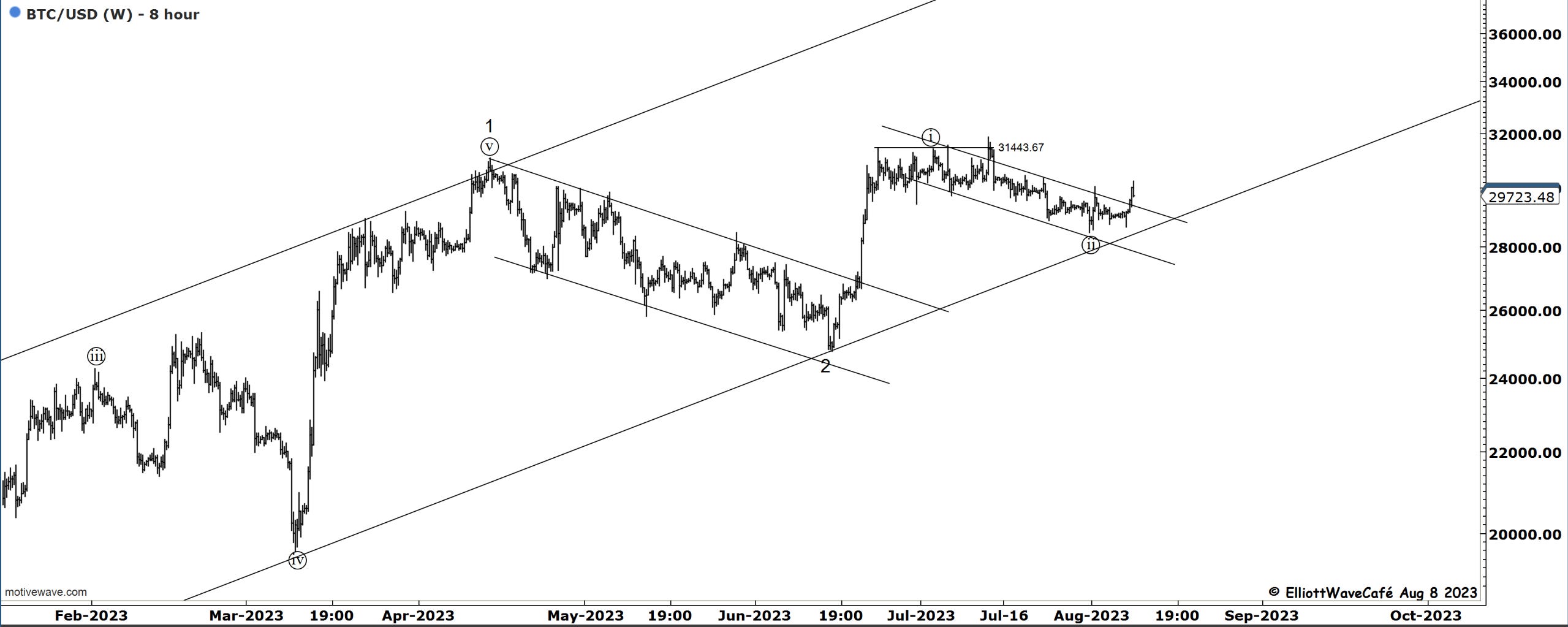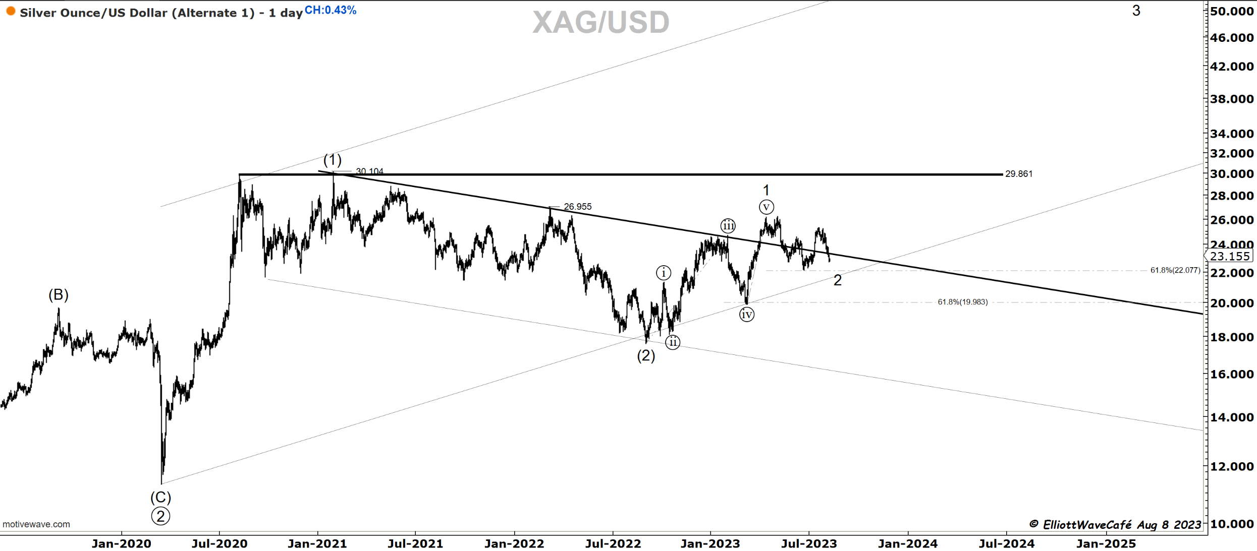 I spent a little time cleaning up the previous silver count and suggesting a leading diagonal with wave 2 in progress. If you measure that wave ((v)) is shorter than ((iii)) by a touch. Maybe in other platforms is ok, but I won’t let that take away from the fact that is pretty good-looking. You can also have a 1,2 1,2 if that makes you happier. Bottom line, we should be heading higher when this wave 2 completes.