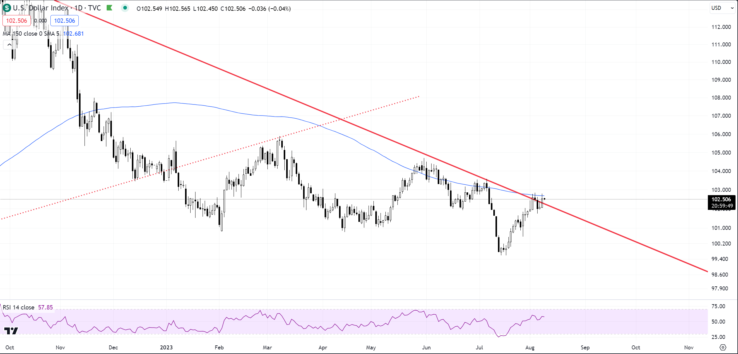The dollar closing above that subjective trendline is a negative for bears, being capped by the 150-day is a positive. I think we fail soon here and resume moving lower. A lower dollar is positive for risk.