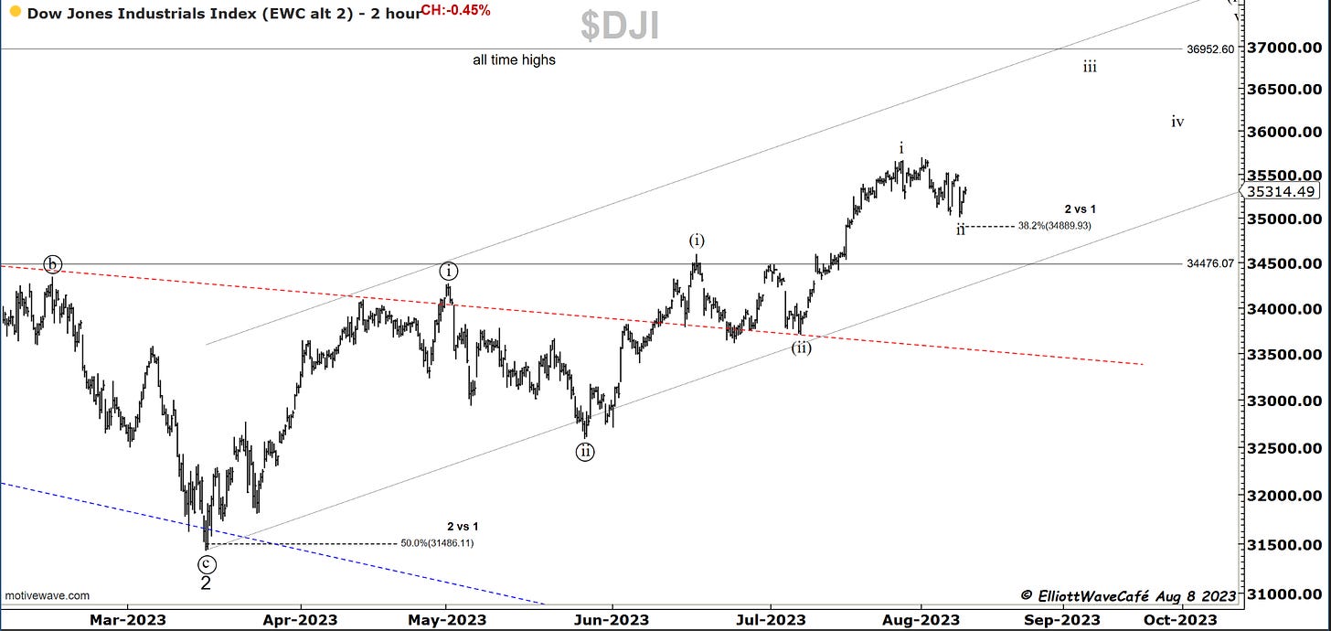 I can’t tell you exactly what’s inside that proposed wave ii drop, but in my view, it does not matter. It’s a yoyo price action, a term that RN Elliott did not have in his vocabulary. What we do know from his writings is that if it’s overlapping a lot it’s probably corrective. I expect the resumption to be to the upside, once this backing and filling is over. I remain very bullish above 34,500.