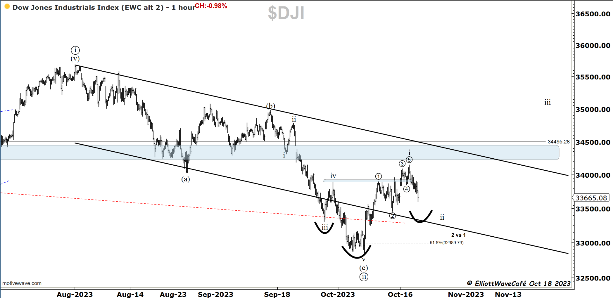 We dumped this index as well although it was the “strongest” of them all. I am contemplating a leading diagonal here with wave ii in progress, but we can easily morph into a flat. As long as the 33k zone remains intact I can maintain the bullish posture.