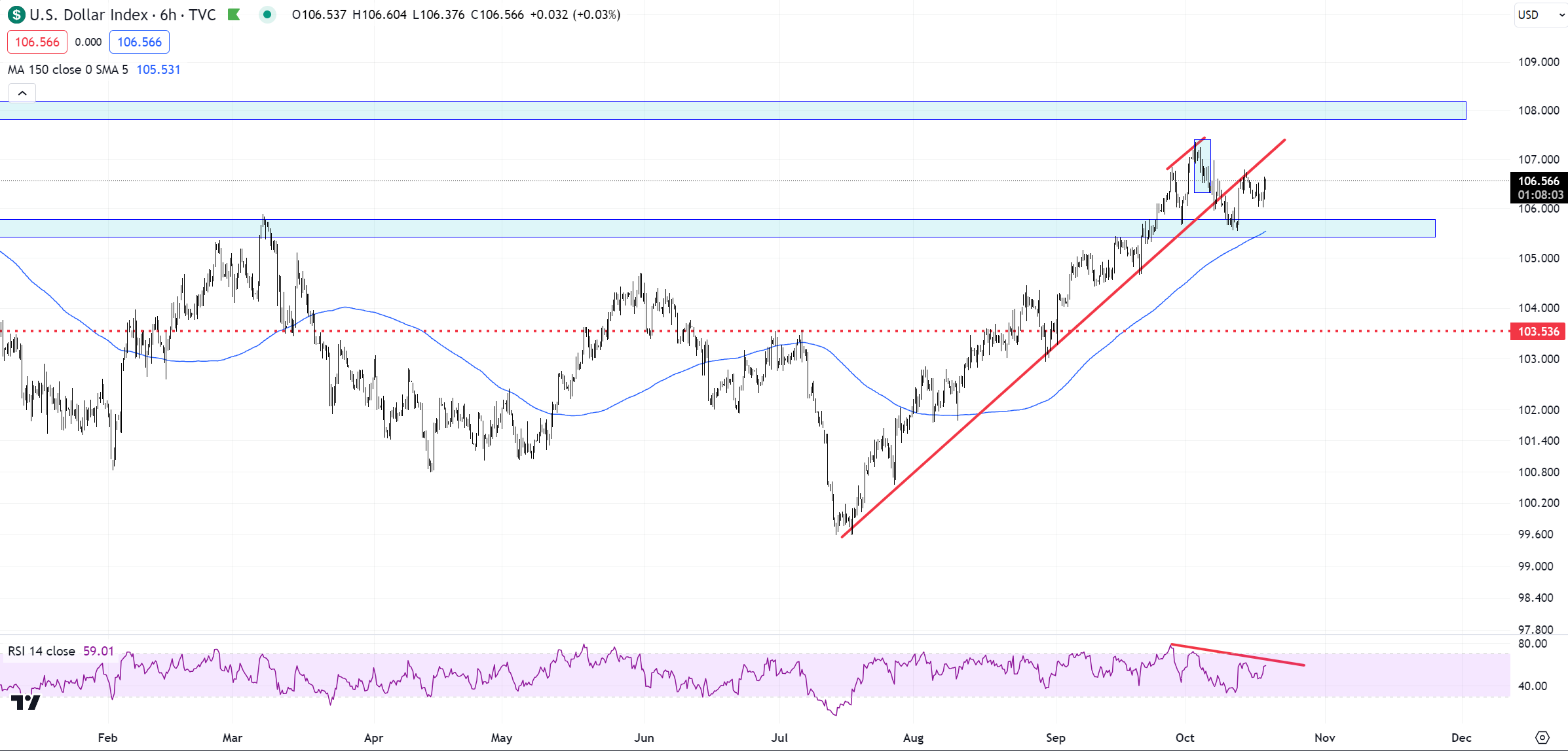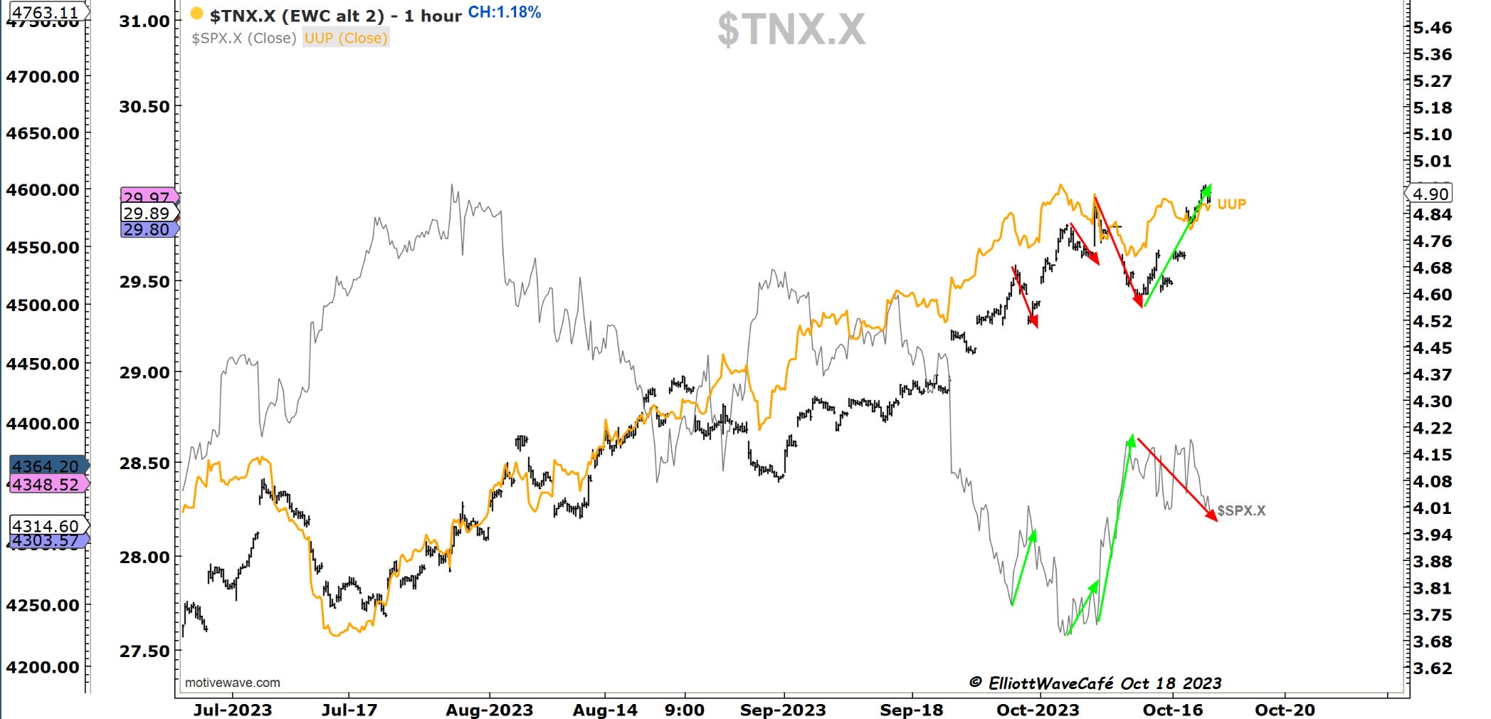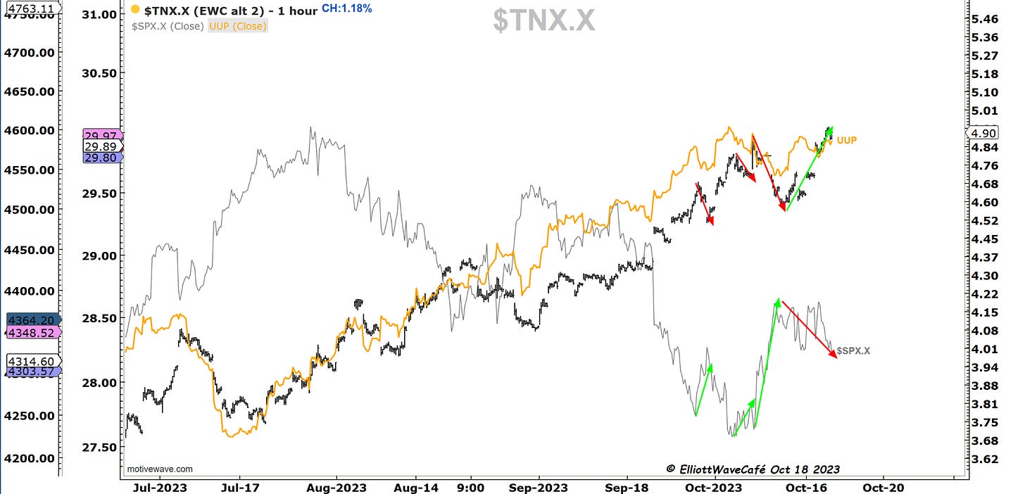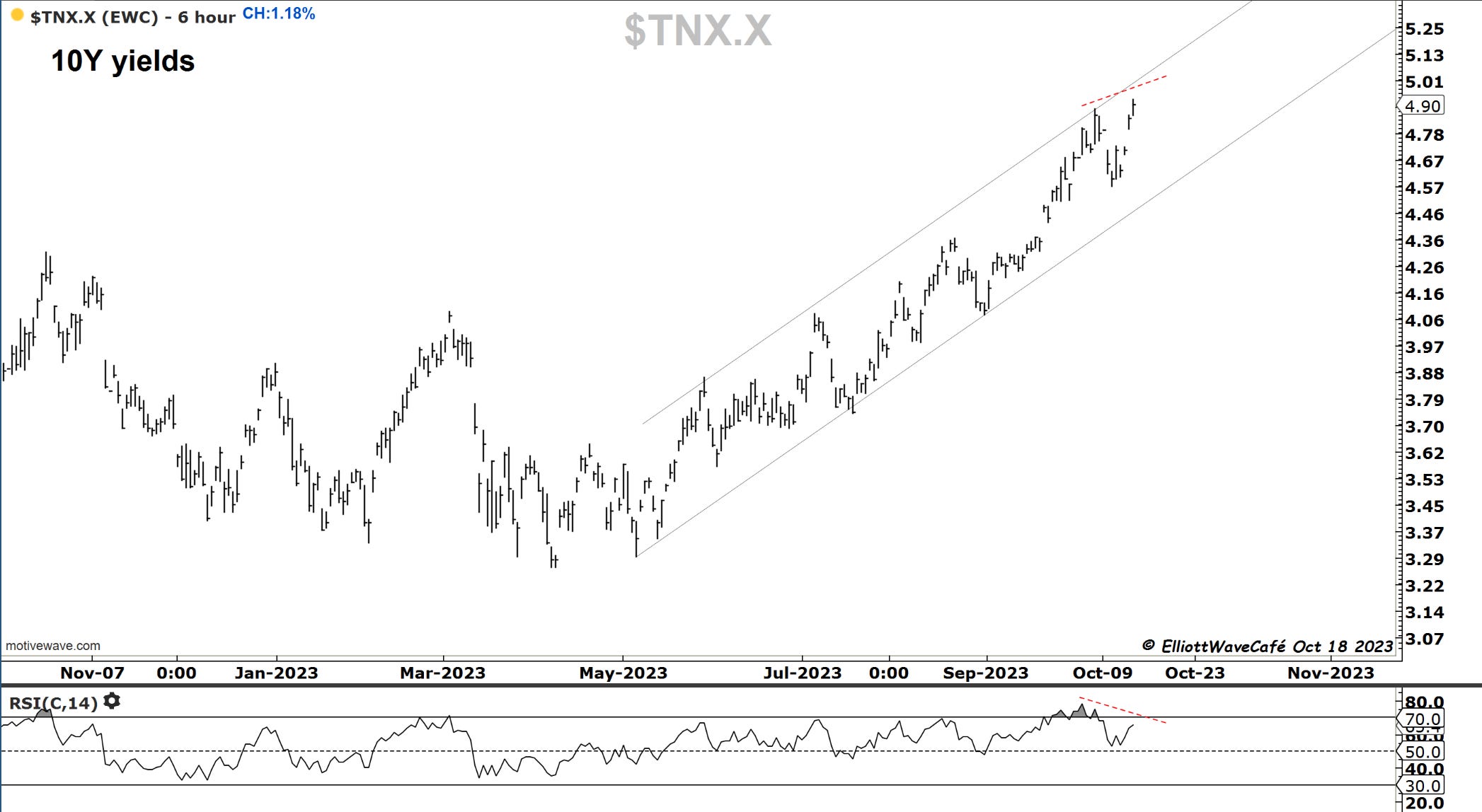 We seem to be losing the USD momentum higher, now we just need to see how yields behave near the 5% mark. The RSI and channel top might give it a pause. (2nd chart) These are early signs of topping but nothing quite concrete yet.