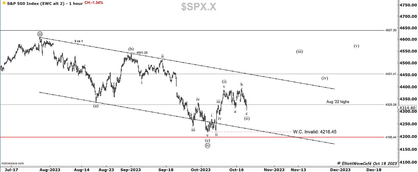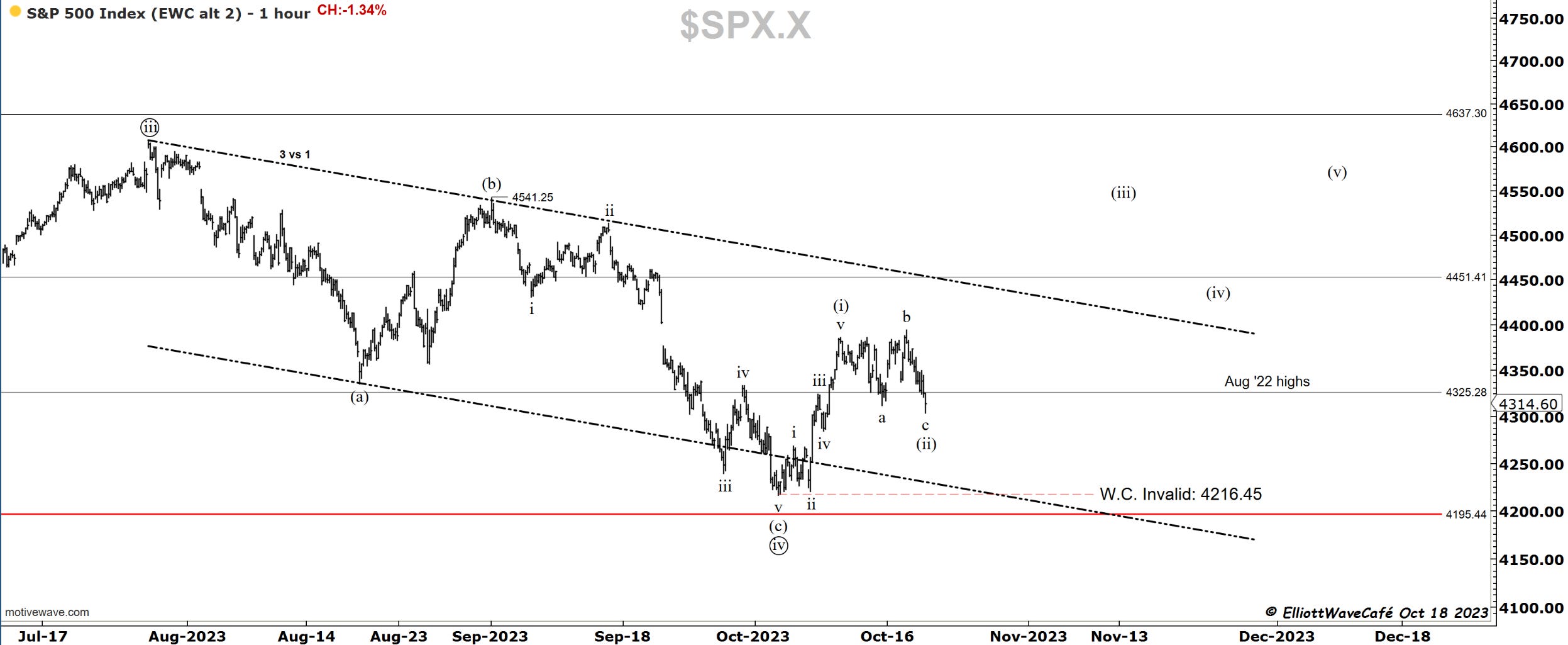 If we look at the chart below we’re getting some proportion between the two selling legs in wave (ii). I was contemplating that wave iv, but the width of the correction makes it far less likely. I like it as a wave (ii) even tho we extended it with one more lower leg. A flat is the verdict here at the moment. At 4280 we have the 61.8% throwback. If we lose that level, the invalidation comes at 4216.