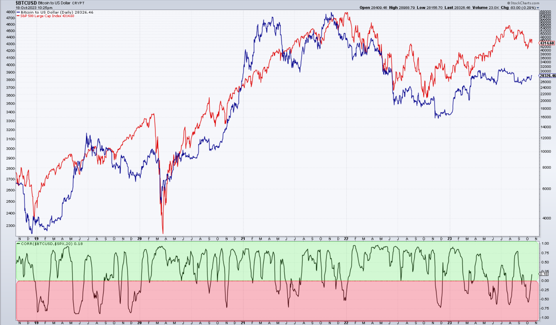 Here is the correlation with the SP500 as a risk proxy. Mostly in the green with slight areas of inverse correlation.