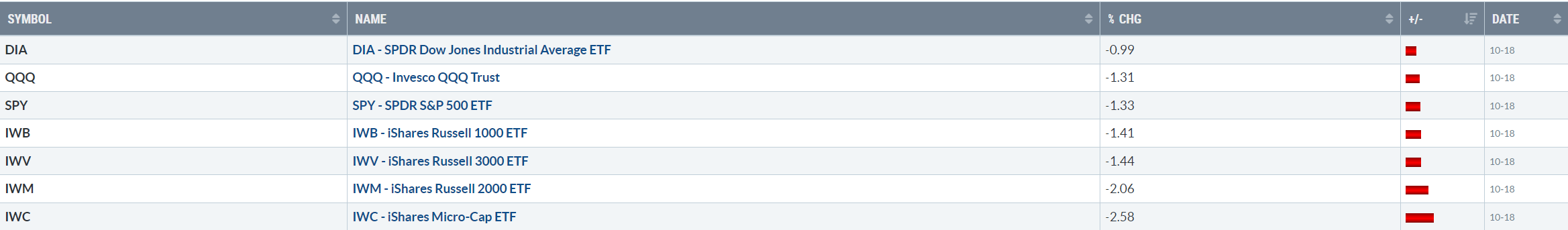 We lost -1.34% today in this index. There was a gap lower at the open, a brief attempt to close it, and an avalanche of selling throughout the rest of the day. There are plenty of reasons that the news media will give for this action, none of which matter in the slightest. The war, the debt, the earnings, the yields, October weakness, and many more. In the end, the market rejected higher for now, and that’s it.