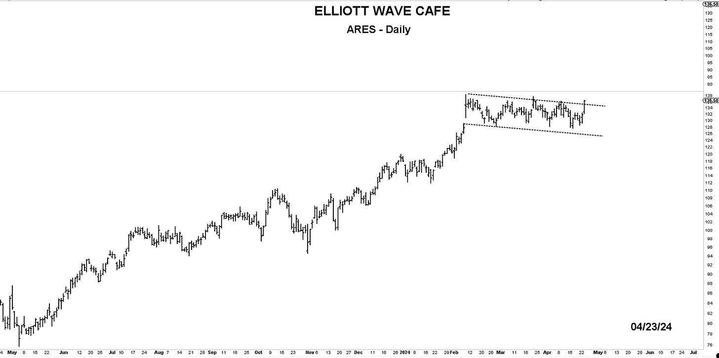 Chart of the Day—ARES—A textbook corrective structure put this stock into a relaxed mode beginning Feb 8th. Today it is attempting to break that structure with a close at the highs of 136.50. Using 132 as defense, it provide a small risk for a bet towards a larger breakout.