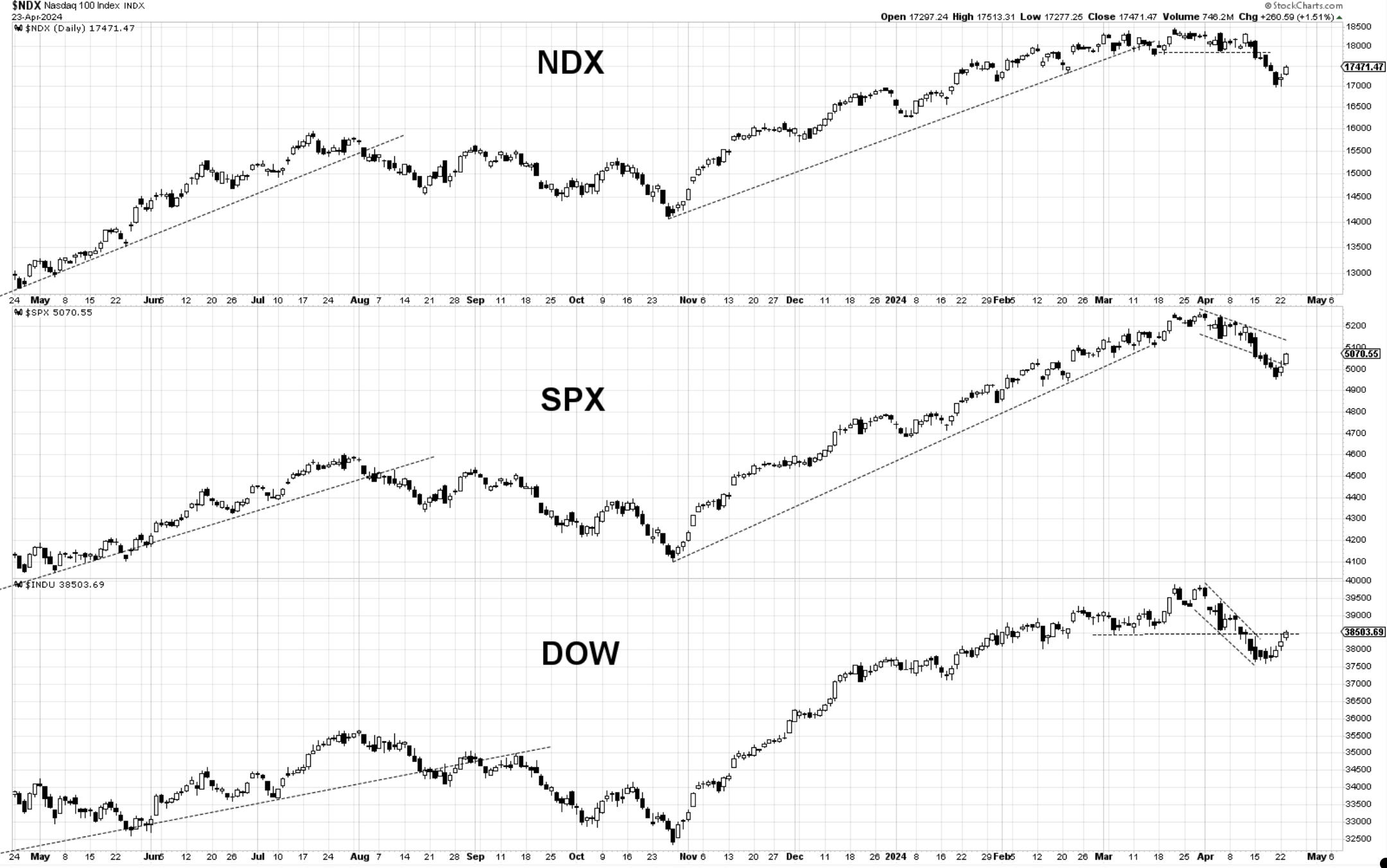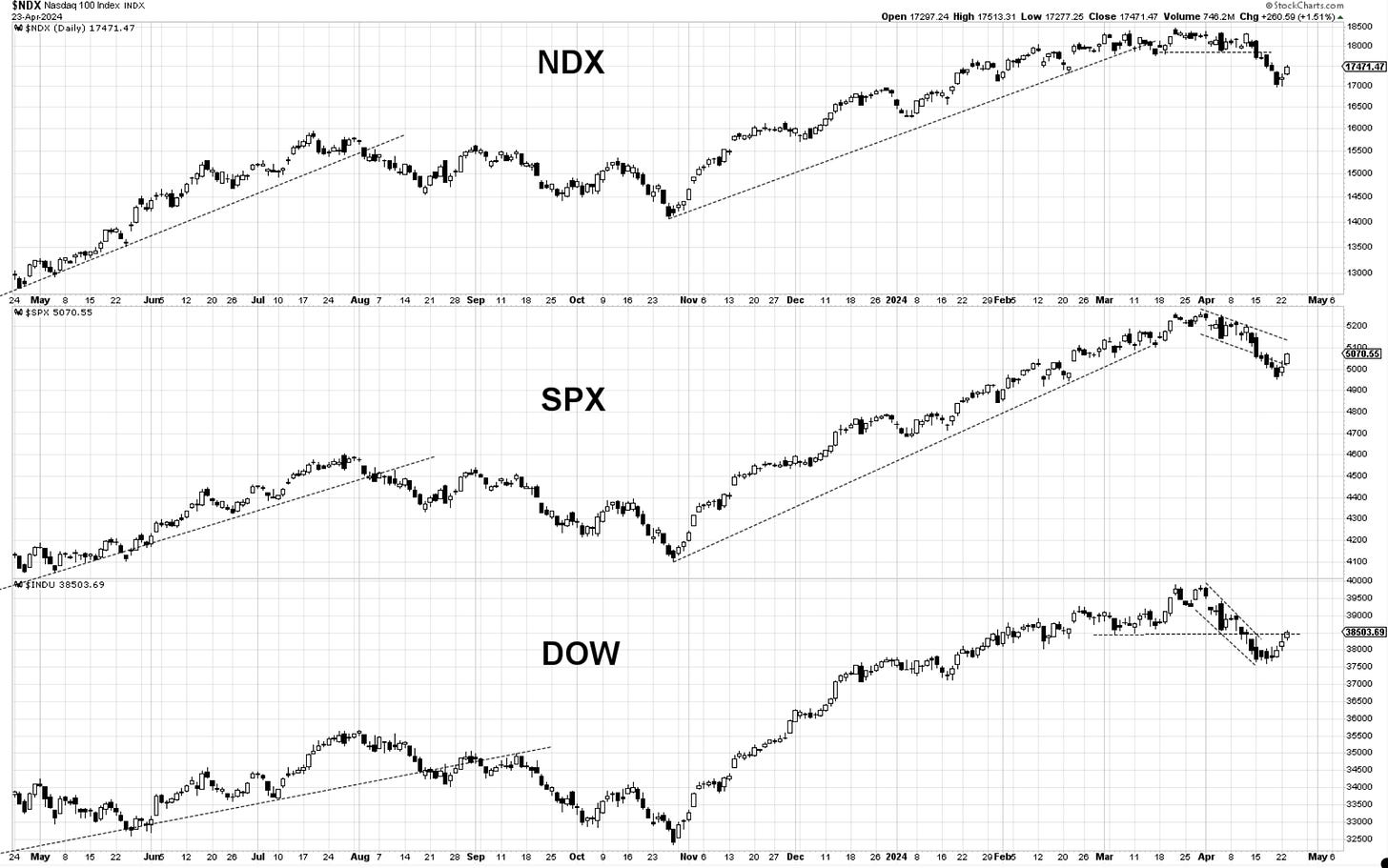 Bottom Line: Markets have staged gains above 1% today, less Dow at 0.69%. The proof of securing a low on Friday, April 19th, continues to build. There is a bit more work that indices need to do, but the breadth has been strong, with advancing stocks beating the declining ones 5 to 1 on the NYSE. We are now heading with strength into zones where markets broke lower from about a week and a half ago. Getting through those without failures or rejections is the next test of the bulls.