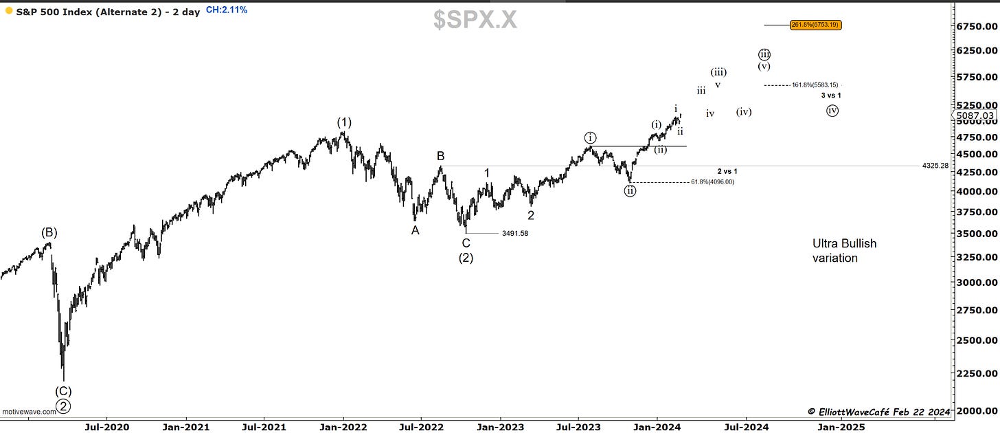 Here is the count that the market is imposing on us with its current behavior. A part of me is still thinking about this being a fifth wave as shown in prior updates, it’s just getting way to long from standard counts and it’s not usually a characteristic of equity markets to have extended 5th waves. Those appear mostly in commodities uptrends during times of fear. I will refer to this from now on and send the 5th wave idea to the back burner and monitor in the background.