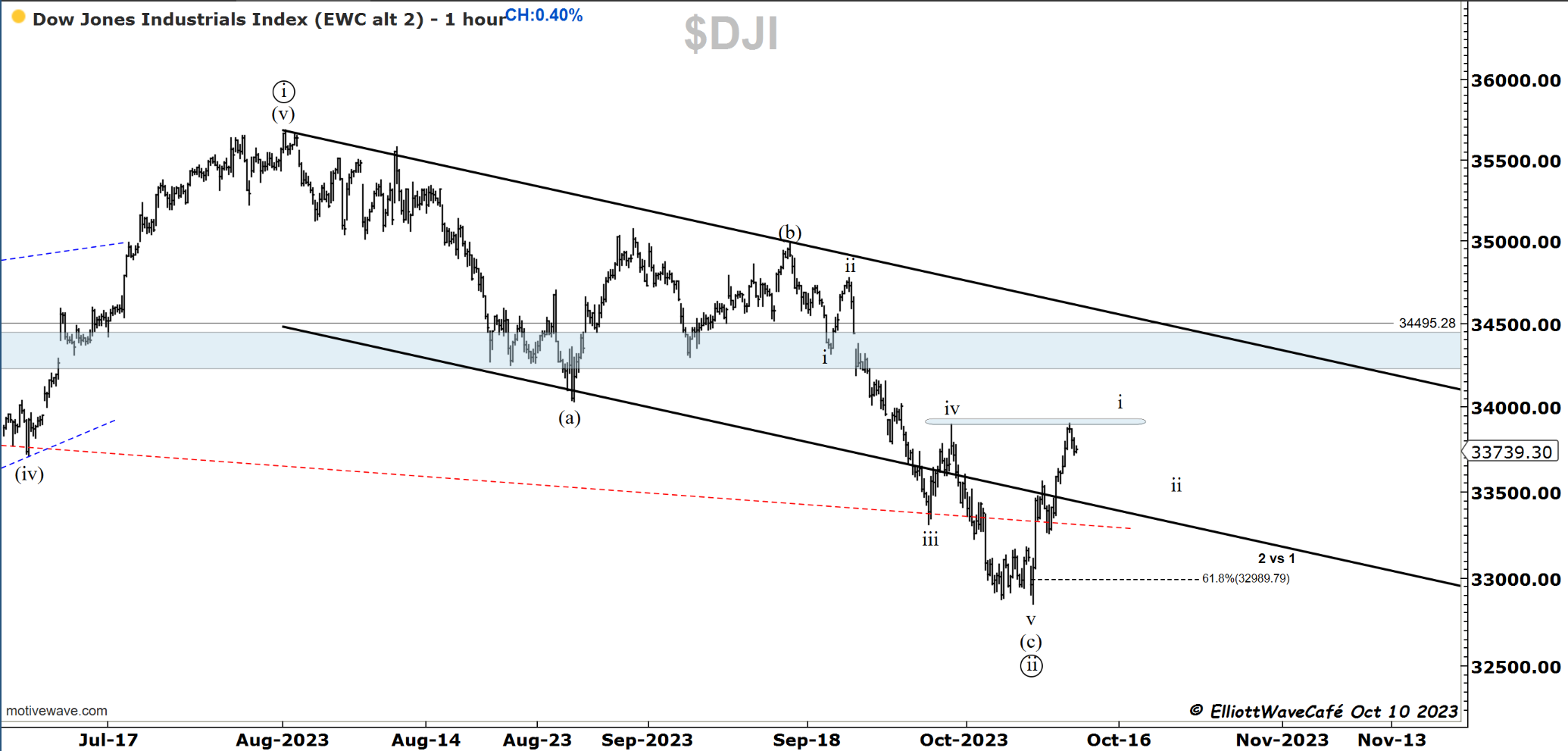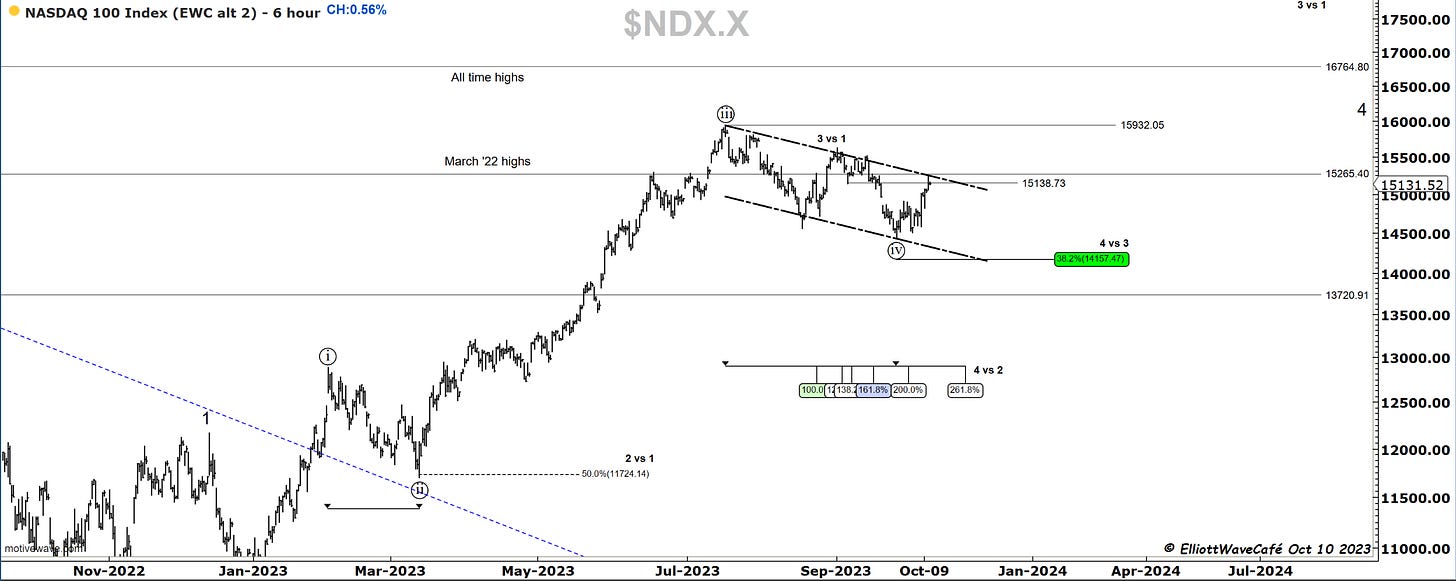 NDX climbed above 15,138 today eliminating the possibility of this rally being a 4th wave from the prior Sept 1st decline. This further strengthens the case for a completion of ((iv)). However, we are now once again at the March ‘22 highs, a strong battle zone between supply and demand. The channel top resides here as well along with a declining 50 day MA. If she can surpass this hurdle and break 15,500, the floodgates should open wider for the upside. On the contrary, the creation of an X wave here would derail the advance until the larger correction is completed. Below 14,600 that becomes a real possibility.
