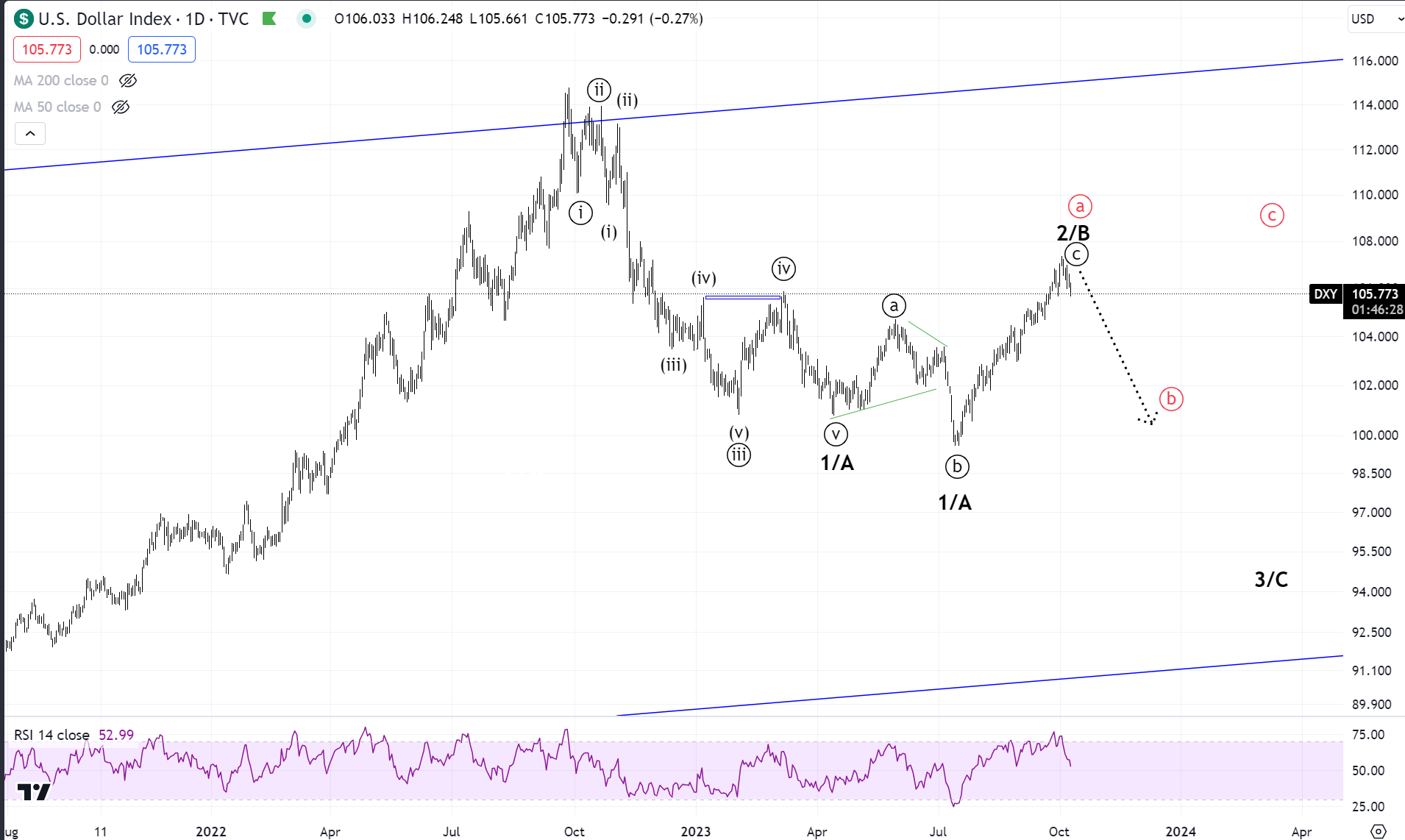 US dollar has topped, now the question is do we have a ((b)) wave throwback from an ABC, or the beginning of the decline in wave 3 or C. I can’t read the future and no one else can either but I will use this roadmap for now and take the clues as they come, along with the other intermarket analysis.