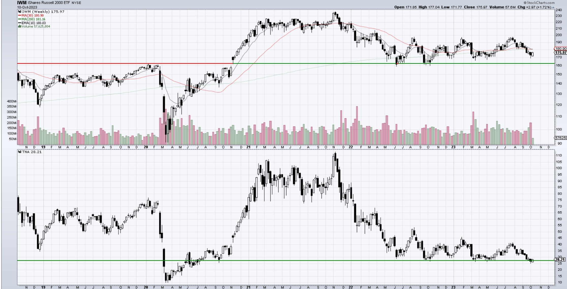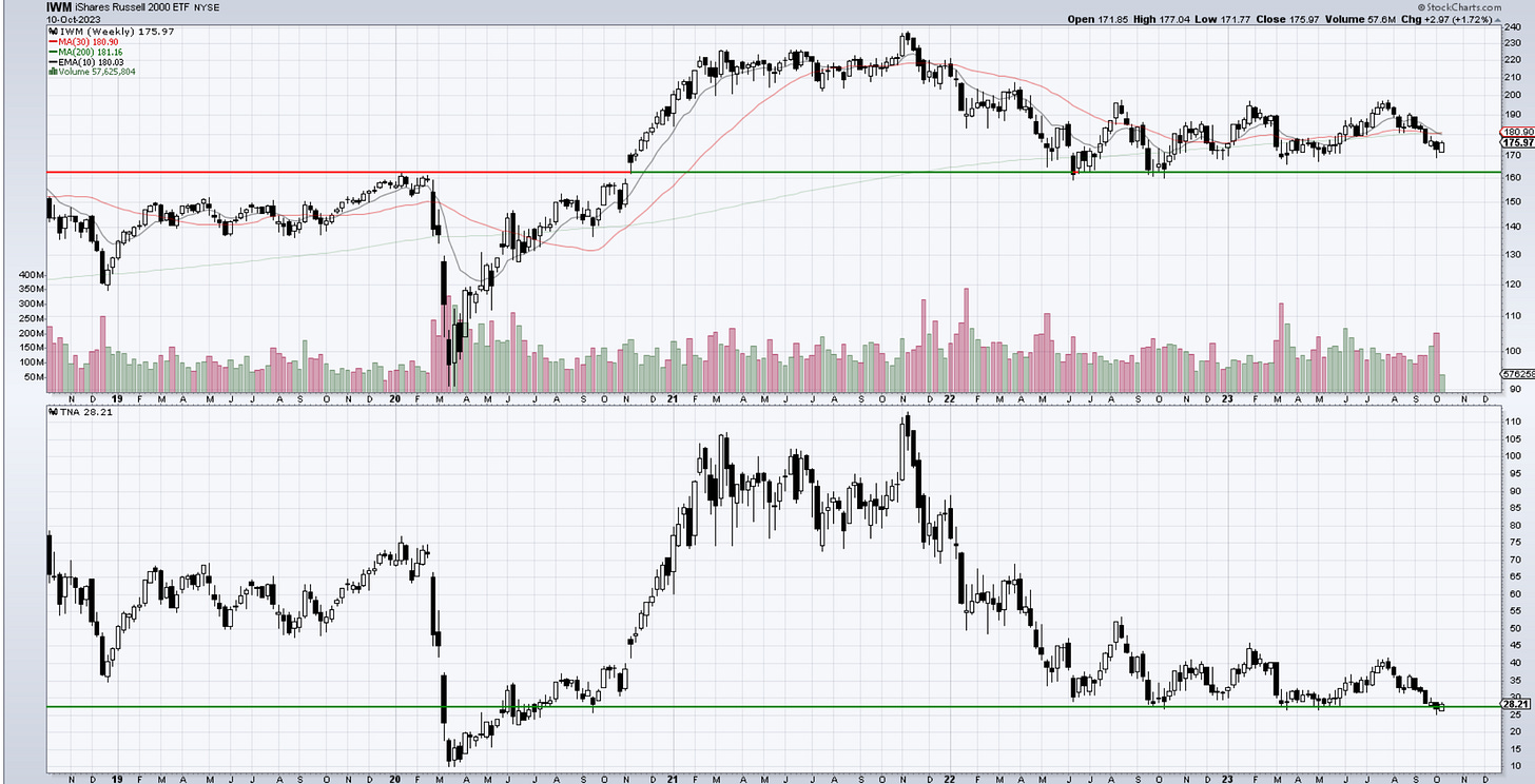 We took partial profits in the TNA longs ( this is the 3x leveraged Russell). We bought this on IWM support. Take a look below at how different the price action is longer term between the 2 charts and why these are very hard to hold long term. Good vehicles to take advantage of trading levels tho.