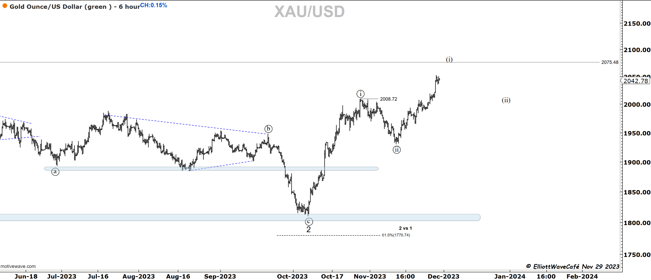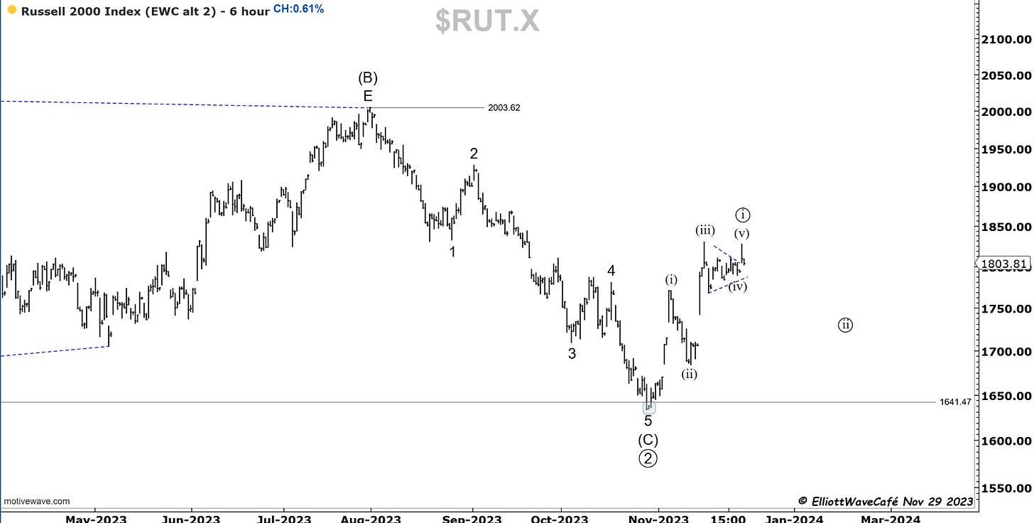 Higher again. Could this really be the moment for gold? I am not fully dismissing yet that B wave of a flat for ((ii)), but if this is correct it will only shake out late buyers before resuming the trend. Watching for that (i) (ii) as the lower degree move that will build the larger wave ((iii)). Strap on, this could get a wild ride come 2024.
