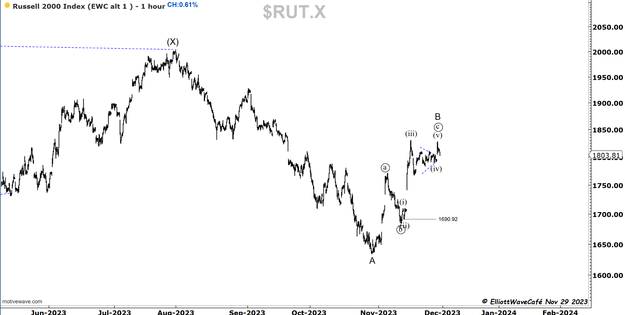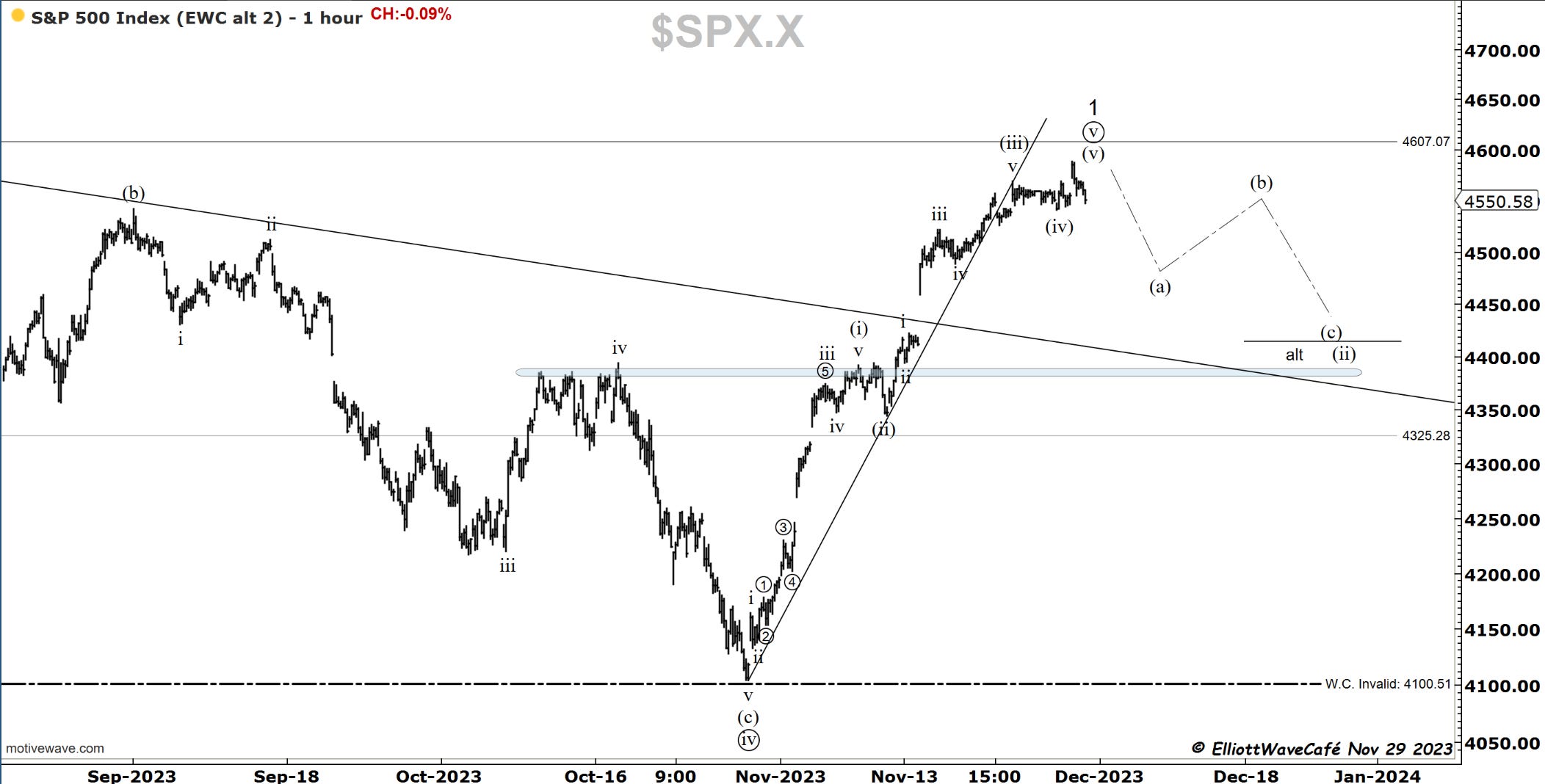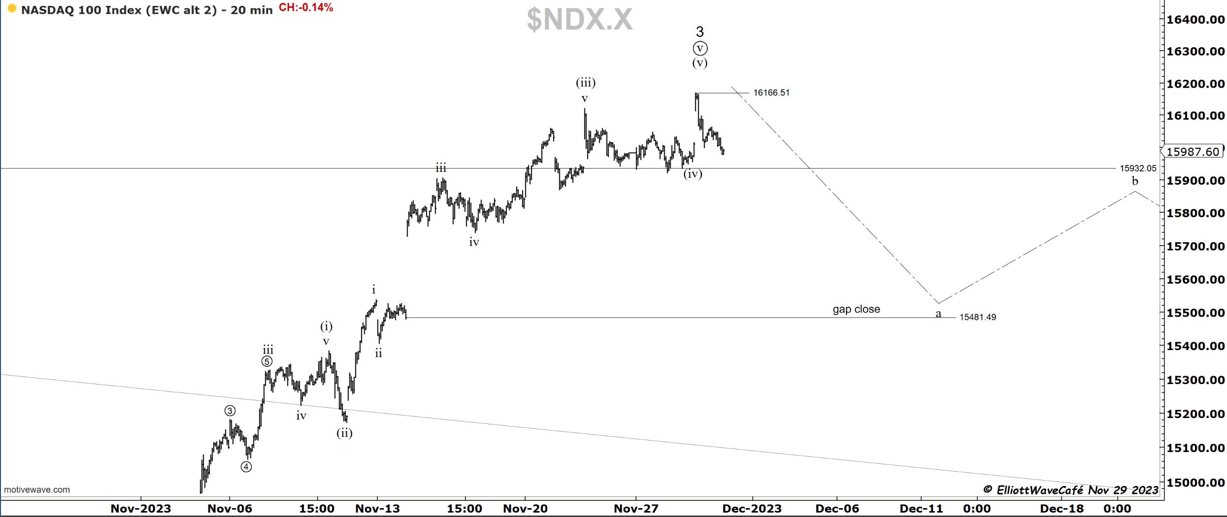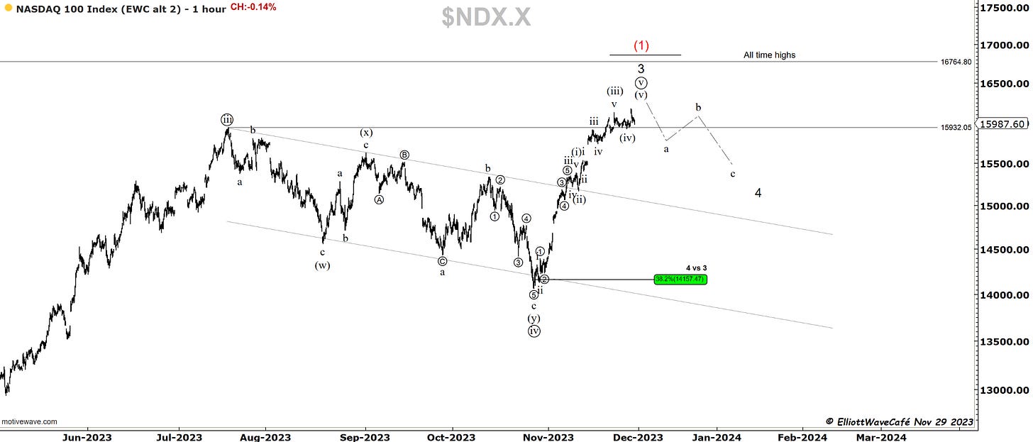 My take here is that if this correction is starting, then the only Santa rally we will get will be a (b) wave. The pundits will cheer it on, but we will know what’s behind it.