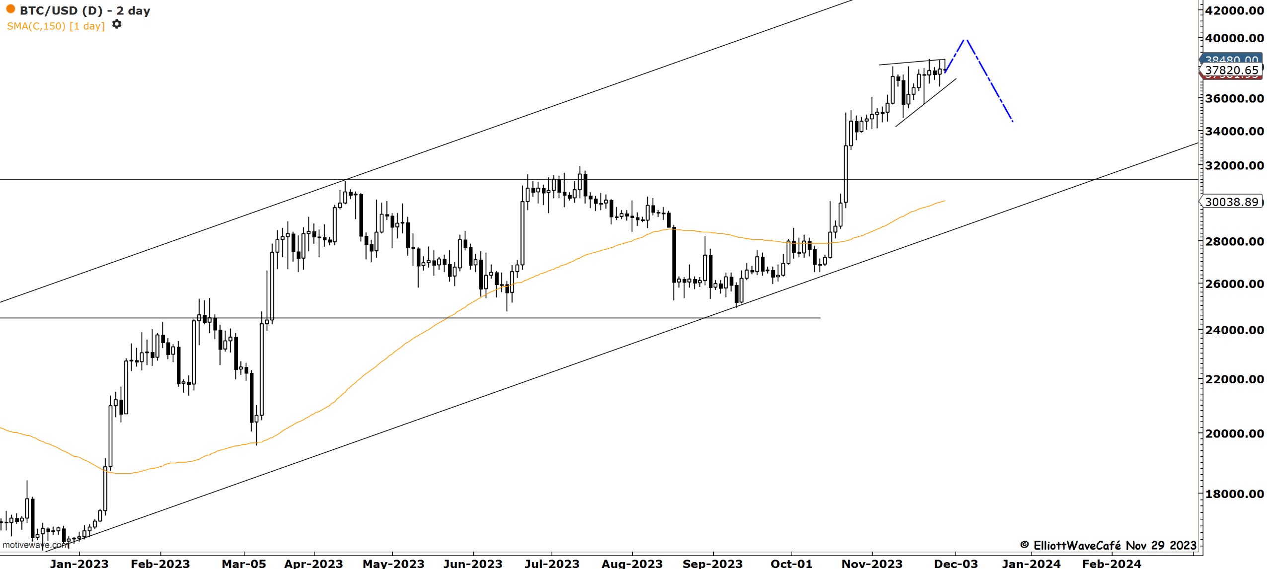 Someone is really protecting that 38k level. But every lower swing is higher than the one before, meaning traders are lifting their bids. Something will have to give soon enough. I think the market wants to see who’s hiding above 38k. The question is what happens after we get there? Do we unleash an avalanche of stops and rally strongly, or does the market take them out and reverse? There are several tactics to play this which I won’t get into here. Based on some of the 150-180 day cycle work I follow combined with a nearby wave 5 top, I am still wary into 40k.