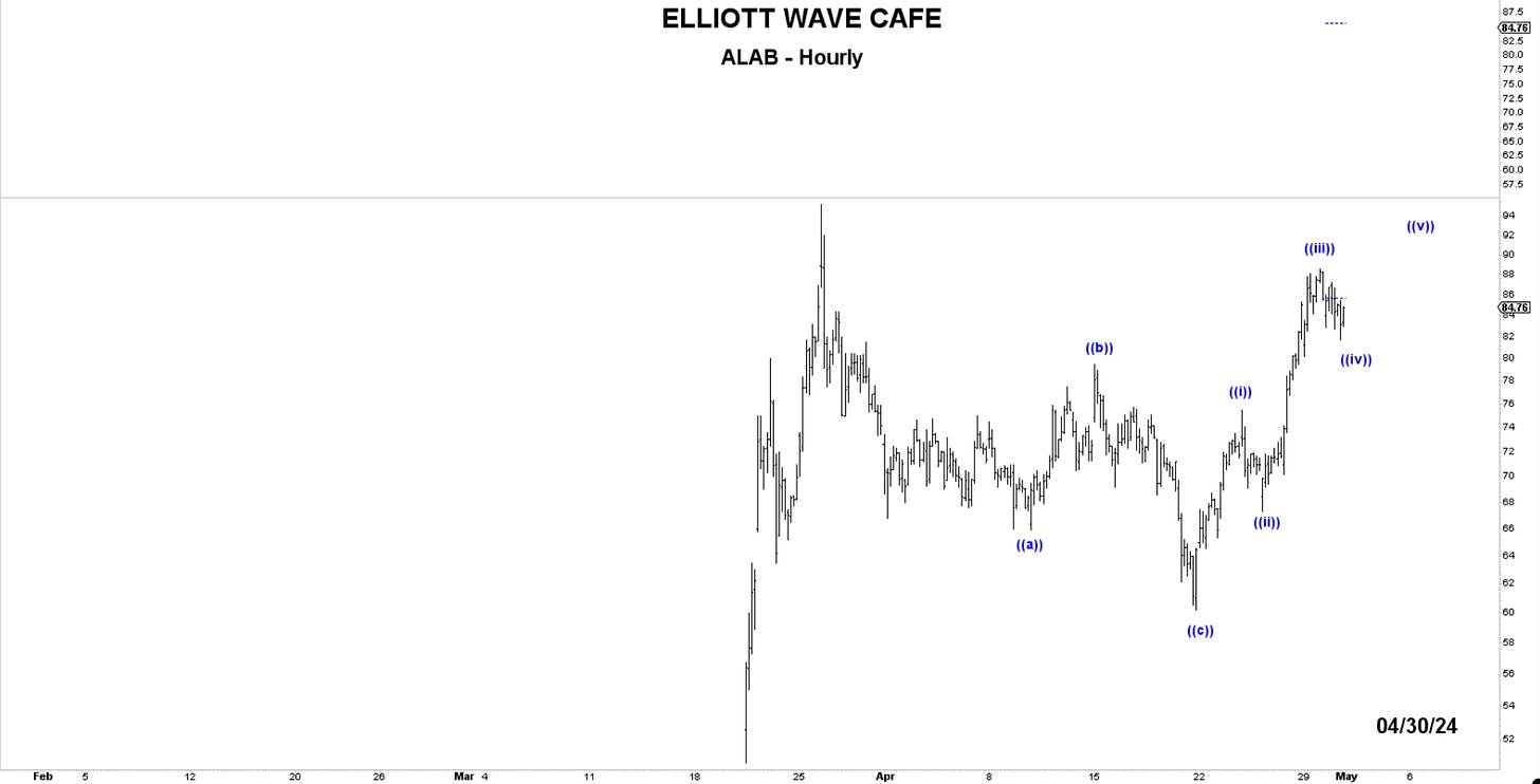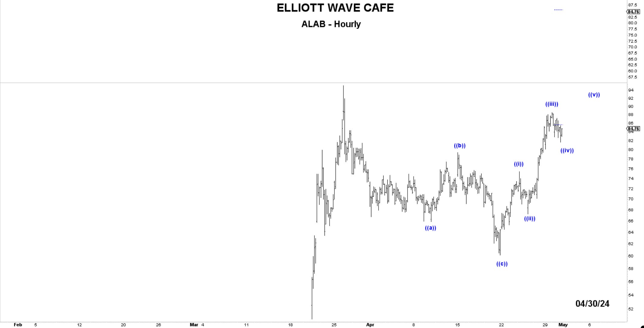 Chart of the Day—ALAB—Fresh IPO in semicondutor/AI arena. There has been a three-wave correction after the initial rally. The buildup of a five-wave move is in progress. Ideally, wave ((iv)) should stay at 38.2% compared to wave ((iii)).