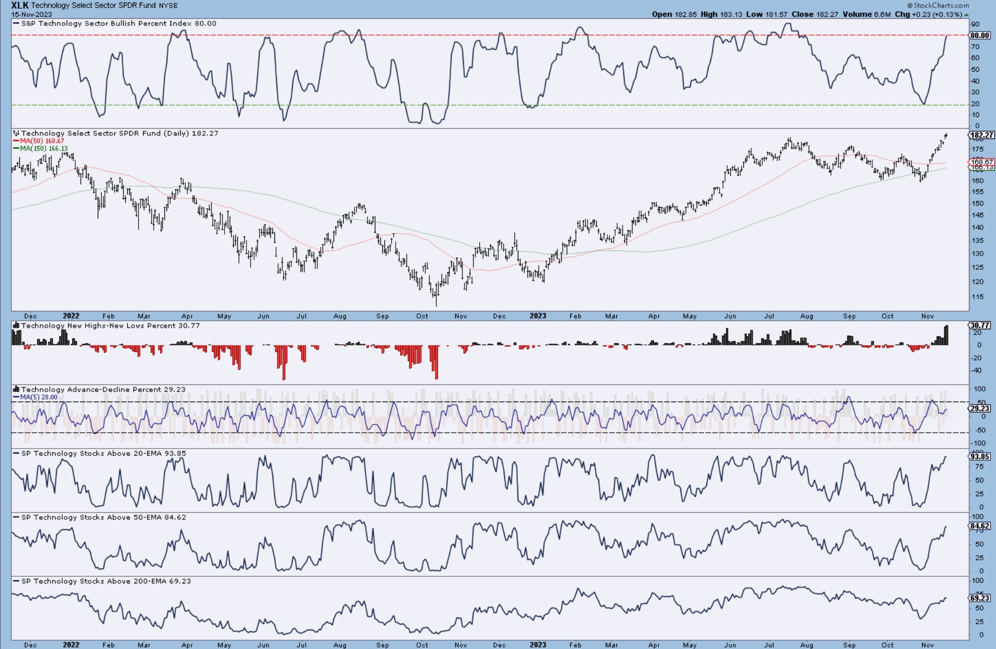 Here is the only sector from the 11 present on the SP500 that’s starting to overheat. I characterize overheating by the BPI ( bullish percent index) above 80. If you remember we turned bullish on the SPY when BPI started to hit lower bands at 30 and 25. This can still trend higher near term and remain overheated, but it’s on the radar for profit-taking and eventually shorting in the near future. Would like to see some breadth deterioration from % above key moving averages, along with advance- declines.