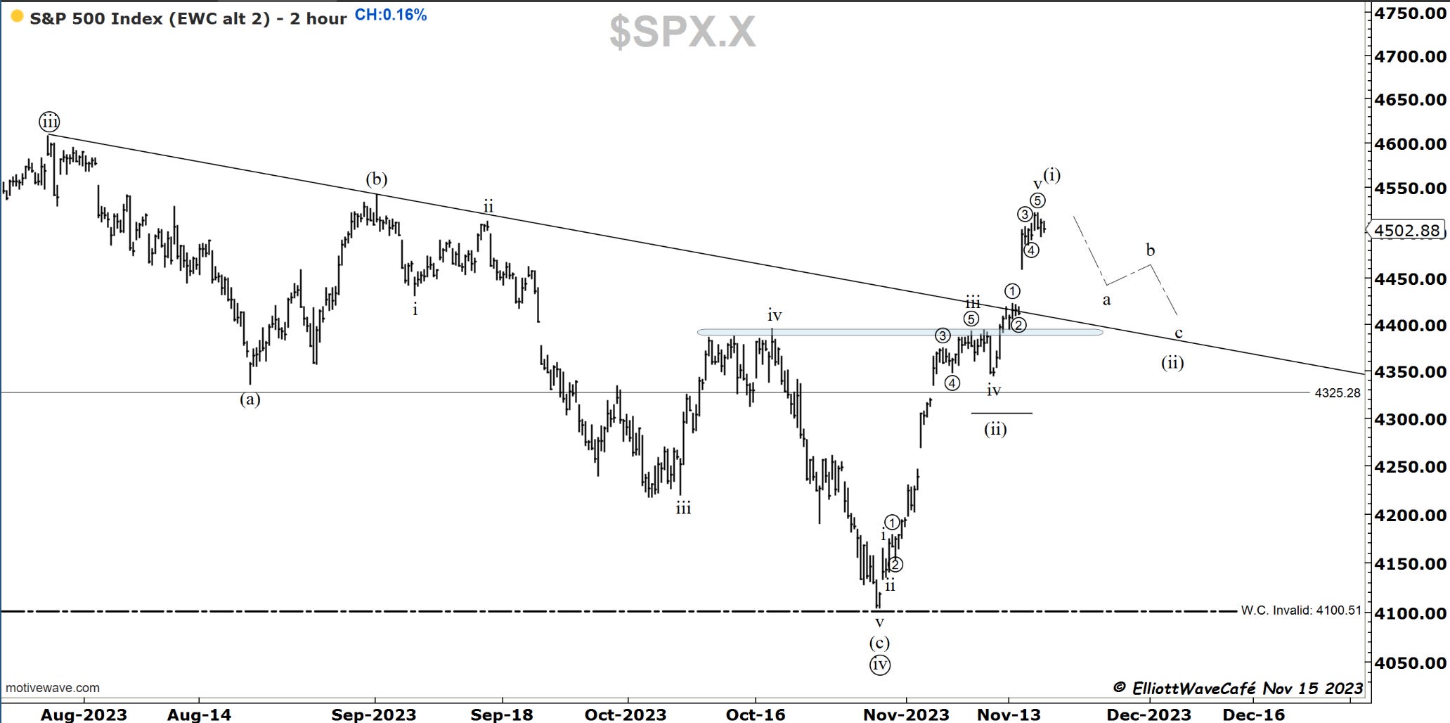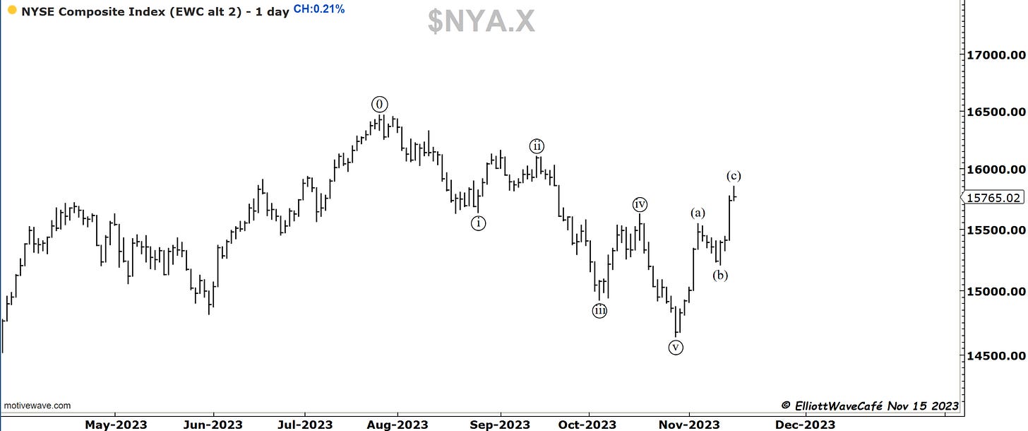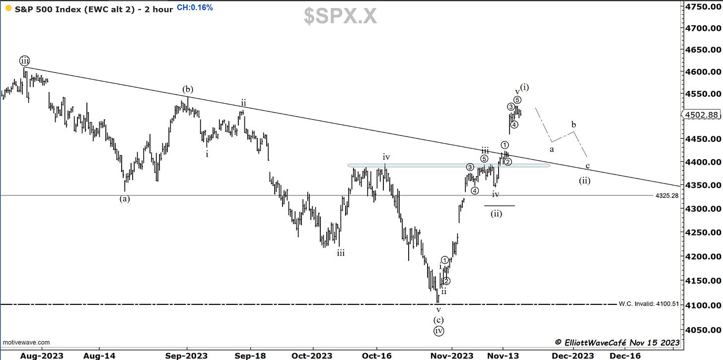 This index closed flat on the day, while the futures that close an hour later than cash, closed negative 25bps. My focus remains on that wave (ii) throwback for a percentage of the entire rally. At least 25% if not 38%.