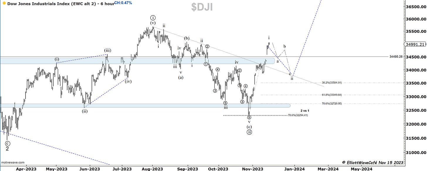 We are approaching the next resistance in the Dow and looking for a wave ii throwback. Do you see the difference between the NYSE chart above and this one? While that one is easier to label as an ABC rally, along with the Russell2k, this one, NASDAQ and sp500 are not that easy. It does look more like a 5wave move. Very curious who’s going to be right here and how we reconcile these waves discrepancies.